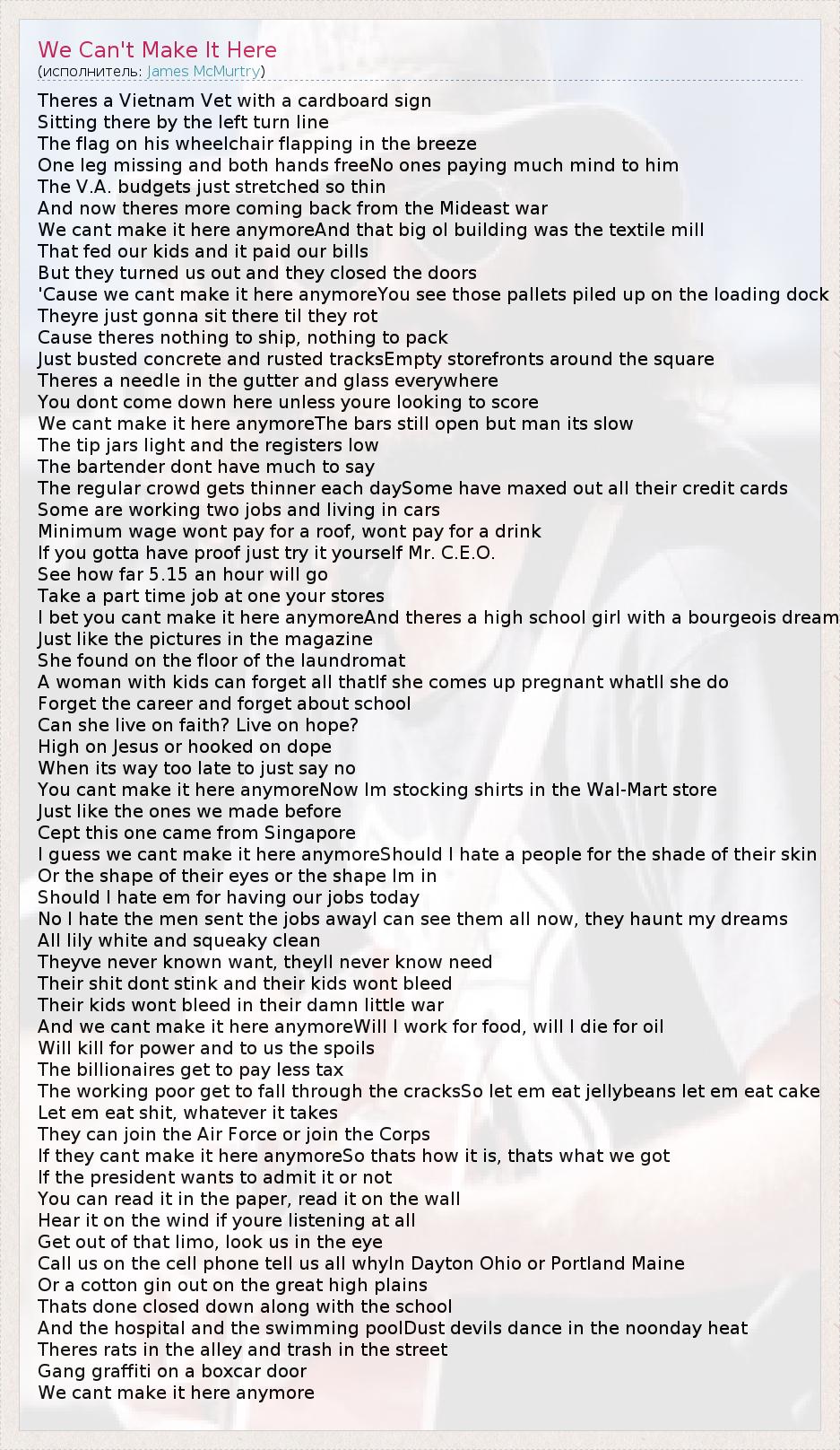 Theres a Vietnam Vet with a cardboard sign Sitting there by the left turn line The flag on his wheelchair flapping in the breeze One leg missing and both hands freeNo ones paying much mind to him The V.A. budgets just stretched so thin And now theres more coming back from the Mideast war We cant make it here anymoreAnd that big ol building was the textile mill That fed our kids and it paid our bills But they turned us out and they closed the doors 'Cause we cant make it here anymoreYou see those pallets piled up on the loading dock Theyre just gonna sit there til they rot Cause theres nothing to ship, nothing to pack Just busted concrete and rusted tracksEmpty storefronts around the square Theres a needle in the gutter and glass everywhere You dont come down here unless youre looking to score We cant make it here anymoreThe bars still open but man its slow The tip jars light and the registers low The bartender dont have much to say The regular crowd gets thinner each daySome have maxed out all their credit cards Some are working two jobs and living in cars Minimum wage wont pay for a roof, wont pay for a drink If you gotta have proof just try it yourself Mr. C.E.O. See how far 5.15 an hour will go Take a part time job at one your stores I bet you cant make it here anymoreAnd theres a high school girl with a bourgeois dream Just like the pictures in the magazine She found on the floor of the laundromat A woman with kids can forget all thatIf she comes up pregnant whatll she do Forget the career and forget about school Can she live on faith? Live on hope? High on Jesus or hooked on dope When its way too late to just say no You cant make it here anymoreNow Im stocking shirts in the Wal-Mart store Just like the ones we made before Cept this one came from Singapore I guess we cant make it here anymoreShould I hate a people for the shade of their skin Or the shape of their eyes or the shape Im in Should I hate em for having our jobs today No I hate the men sent the jobs awayI can see them all now, they haunt my dreams All lily white and squeaky clean Theyve never known want, theyll never know need Their shit dont stink and their kids wont bleed Their kids wont bleed in their damn little war And we cant make it here anymoreWill I work for food, will I die for oil Will kill for power and to us the spoils The billionaires get to pay less tax The working poor get to fall through the cracksSo let em eat jellybeans let em eat cake Let em eat shit, whatever it takes They can join the Air Force or join the Corps If they cant make it here anymoreSo thats how it is, thats what we got If the president wants to admit it or not You can read it in the paper, read it on the wall Hear it on the wind if youre listening at all Get out of that limo, look us in the eye Call us on the cell phone tell us all whyIn Dayton Ohio or Portland Maine Or a cotton gin out on the great high plains Thats done closed down along with the school And the hospital and the swimming poolDust devils dance in the noonday heat Theres rats in the alley and trash in the street Gang graffiti on a boxcar door We cant make it here anymore