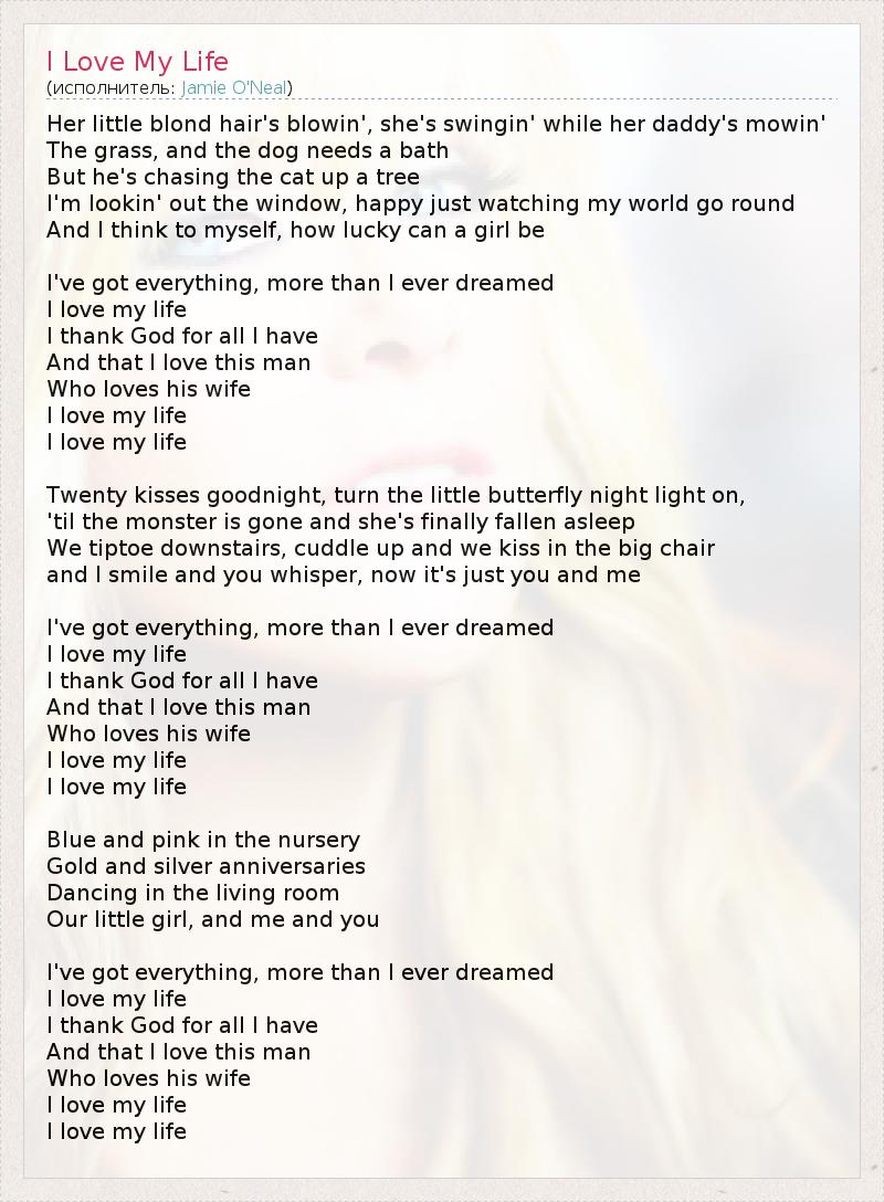 Her little blond hair's blowin', she's swingin' while her daddy's mowin' The grass, and the dog needs a bath But he's chasing the cat up a tree I'm lookin' out the window, happy just watching my world go round And I think to myself, how lucky can a girl be I've got everything, more than I ever dreamed I love my life I thank God for all I have And that I love this man Who loves his wife I love my life I love my life Twenty kisses goodnight, turn the little butterfly night light on, 'til the monster is gone and she's finally fallen asleep We tiptoe downstairs, cuddle up and we kiss in the big chair and I smile and you whisper, now it's just you and me I've got everything, more than I ever dreamed I love my life I thank God for all I have And that I love this man Who loves his wife I love my life I love my life Blue and pink in the nursery Gold and silver anniversaries Dancing in the living room Our little girl, and me and you I've got everything, more than I ever dreamed I love my life I thank God for all I have And that I love this man Who loves his wife I love my life I love my life