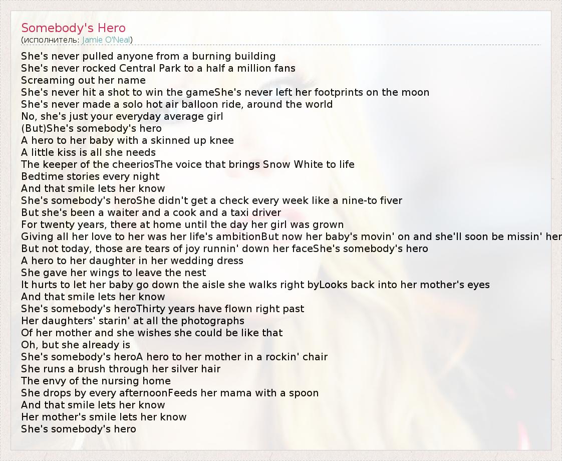 She's never pulled anyone from a burning building She's never rocked Central Park to a half a million fans Screaming out her name She's never hit a shot to win the gameShe's never left her footprints on the moon She's never made a solo hot air balloon ride, around the world No, she's just your everyday average girl (But)She's somebody's hero A hero to her baby with a skinned up knee A little kiss is all she needs The keeper of the cheeriosThe voice that brings Snow White to life Bedtime stories every night And that smile lets her know She's somebody's heroShe didn't get a check every week like a nine-to fiver But she's been a waiter and a cook and a taxi driver For twenty years, there at home until the day her girl was grown Giving all her love to her was her life's ambitionBut now her baby's movin' on and she'll soon be missin' her But not today, those are tears of joy runnin' down her faceShe's somebody's hero A hero to her daughter in her wedding dress She gave her wings to leave the nest It hurts to let her baby go down the aisle she walks right byLooks back into her mother's eyes And that smile lets her know She's somebody's heroThirty years have flown right past Her daughters' starin' at all the photographs Of her mother and she wishes she could be like that Oh, but she already is She's somebody's heroA hero to her mother in a rockin' chair She runs a brush through her silver hair The envy of the nursing home She drops by every afternoonFeeds her mama with a spoon And that smile lets her know Her mother's smile lets her know She's somebody's hero