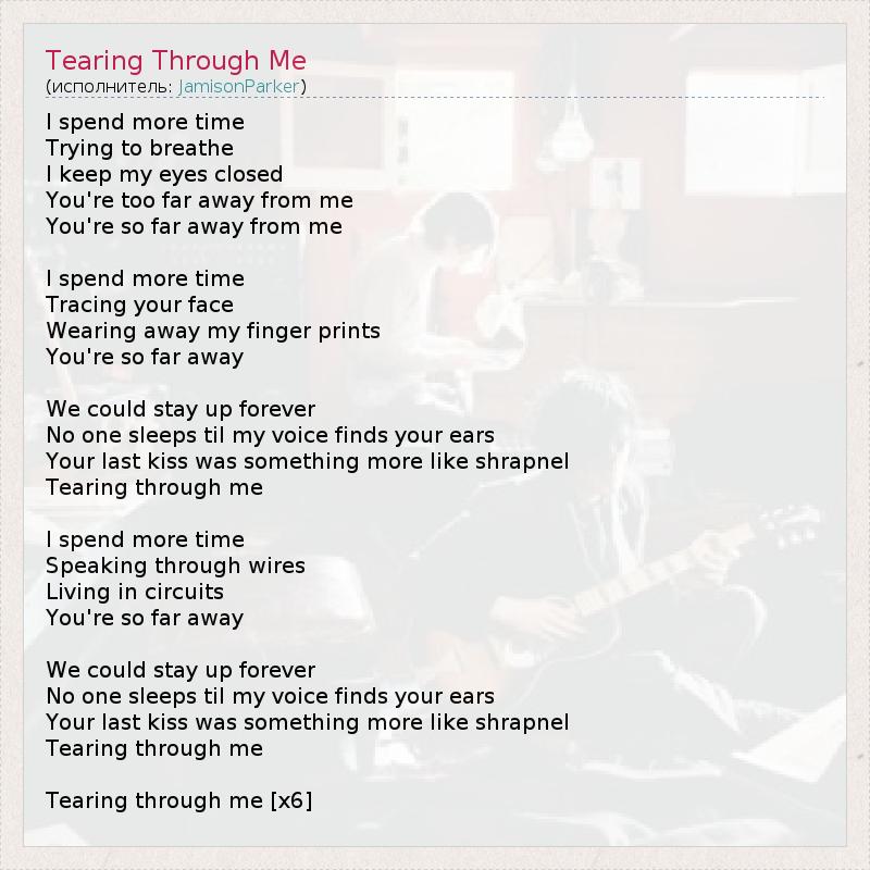 I spend more time Trying to breathe I keep my eyes closed You're too far away from me You're so far away from me I spend more time Tracing your face Wearing away my finger prints You're so far away We could stay up forever No one sleeps til my voice finds your ears Your last kiss was something more like shrapnel Tearing through me I spend more time Speaking through wires Living in circuits You're so far away We could stay up forever No one sleeps til my voice finds your ears Your last kiss was something more like shrapnel Tearing through me Tearing through me [x6]