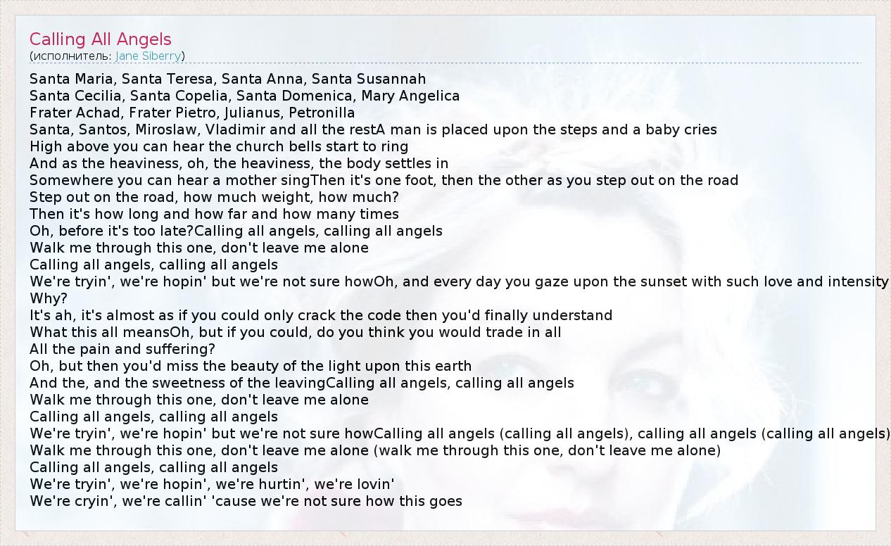 Santa Maria, Santa Teresa, Santa Anna, Santa Susannah Santa Cecilia, Santa Copelia, Santa Domenica, Mary Angelica Frater Achad, Frater Pietro, Julianus, Petronilla Santa, Santos, Miroslaw, Vladimir and all the restA man is placed upon the steps and a baby cries High above you can hear the church bells start to ring And as the heaviness, oh, the heaviness, the body settles in Somewhere you can hear a mother singThen it's one foot, then the other as you step out on the road Step out on the road, how much weight, how much? Then it's how long and how far and how many times Oh, before it's too late?Calling all angels, calling all angels Walk me through this one, don't leave me alone Calling all angels, calling all angels We're tryin', we're hopin' but we're not sure howOh, and every day you gaze upon the sunset with such love and intensity Why? It's ah, it's almost as if you could only crack the code then you'd finally understand What this all meansOh, but if you could, do you think you would trade in all All the pain and suffering? Oh, but then you'd miss the beauty of the light upon this earth And the, and the sweetness of the leavingCalling all angels, calling all angels Walk me through this one, don't leave me alone Calling all angels, calling all angels We're tryin', we're hopin' but we're not sure howCalling all angels (calling all angels), calling all angels (calling all angels) Walk me through this one, don't leave me alone (walk me through this one, don't leave me alone) Calling all angels, calling all angels We're tryin', we're hopin', we're hurtin', we're lovin' We're cryin', we're callin' 'cause we're not sure how this goes