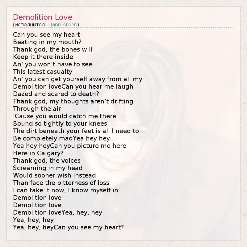 Can you see my heart Beating in my mouth? Thank god, the bones will Keep it there inside An' you won't have to see This latest casualty An' you can get yourself away from all my Demolition loveCan you hear me laugh Dazed and scared to death? Thank god, my thoughts aren't drifting Through the air 'Cause you would catch me there Bound so tightly to your knees The dirt beneath your feet is all I need to Be completely madYea hey hey Yea hey heyCan you picture me here Here in Calgary? Thank god, the voices Screaming in my head Would sooner wish instead Than face the bitterness of loss I can take it now, I know myself in Demolition love Demolition love Demolition loveYea, hey, hey Yea, hey, hey Yea, hey, heyCan you see my heart?