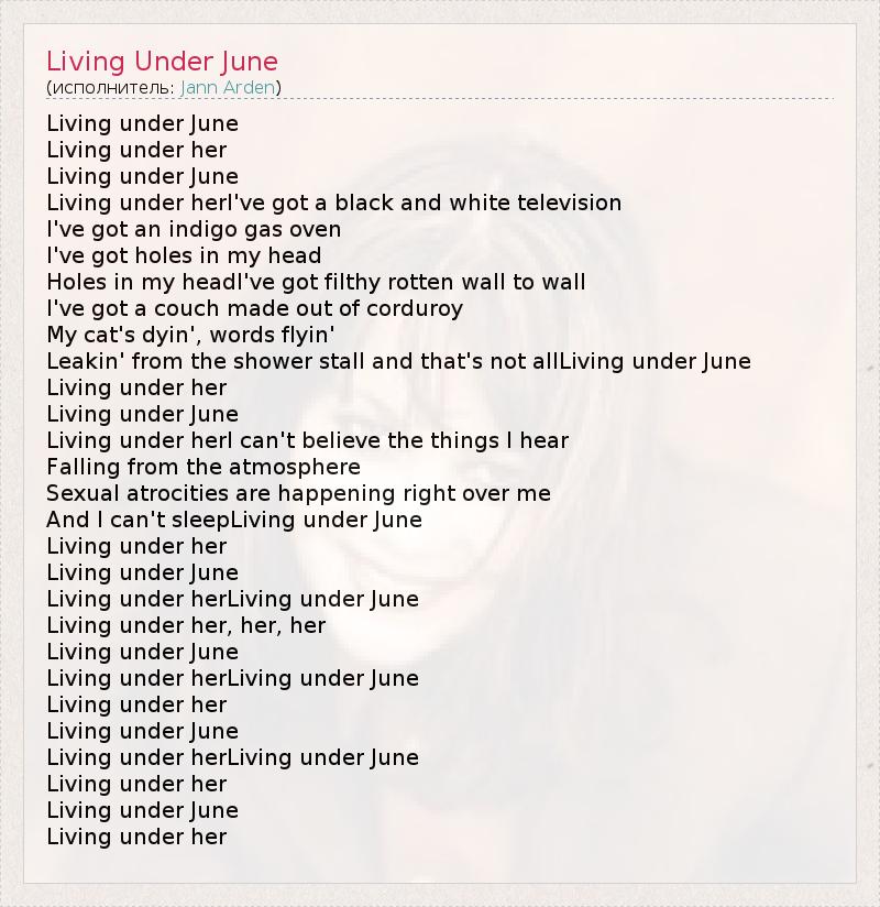 Living under June Living under her Living under June Living under herI've got a black and white television I've got an indigo gas oven I've got holes in my head Holes in my headI've got filthy rotten wall to wall I've got a couch made out of corduroy My cat's dyin', words flyin' Leakin' from the shower stall and that's not allLiving under June Living under her Living under June Living under herI can't believe the things I hear Falling from the atmosphere Sexual atrocities are happening right over me And I can't sleepLiving under June Living under her Living under June Living under herLiving under June Living under her, her, her Living under June Living under herLiving under June Living under her Living under June Living under herLiving under June Living under her Living under June Living under her