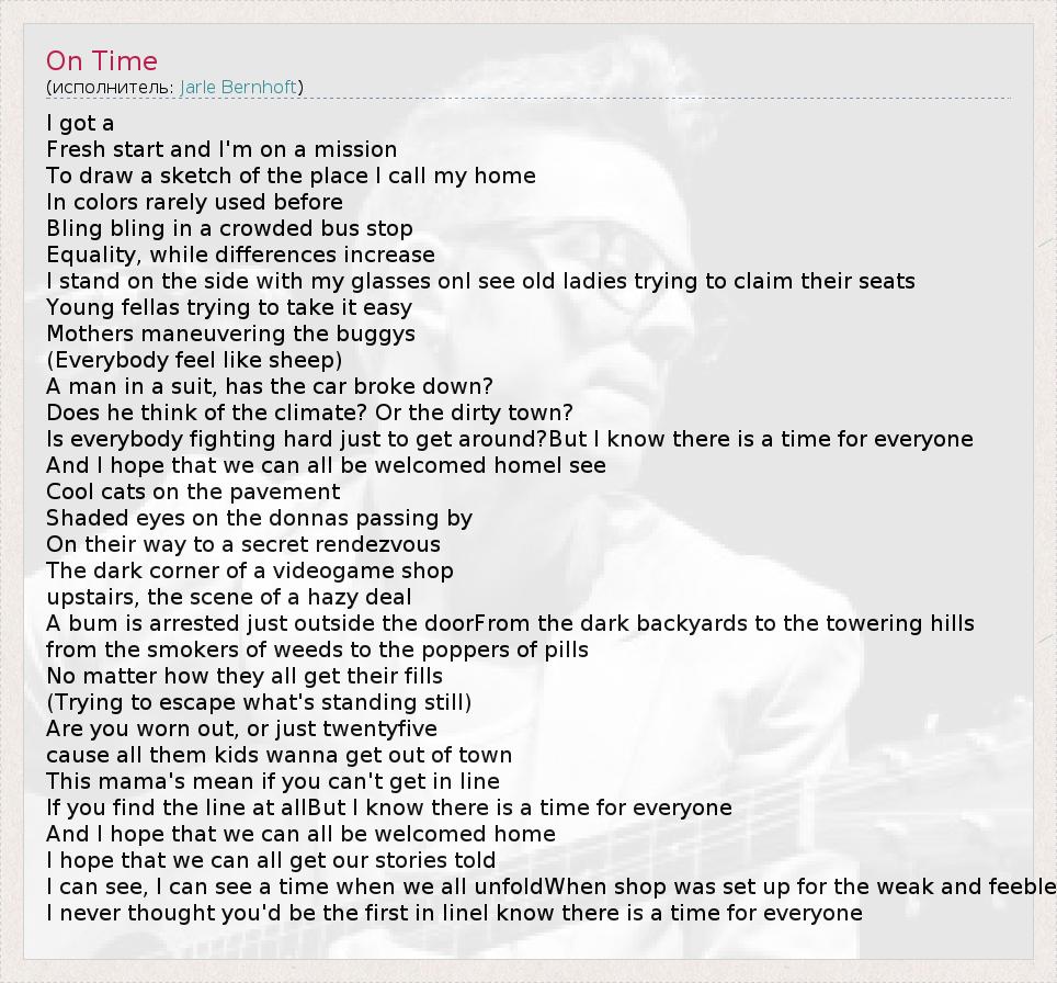 I got a Fresh start and I'm on a mission To draw a sketch of the place I call my home In colors rarely used before Bling bling in a crowded bus stop Equality, while differences increase I stand on the side with my glasses onI see old ladies trying to claim their seats Young fellas trying to take it easy Mothers maneuvering the buggys (Everybody feel like sheep) A man in a suit, has the car broke down? Does he think of the climate? Or the dirty town? Is everybody fighting hard just to get around?But I know there is a time for everyone And I hope that we can all be welcomed homeI see Cool cats on the pavement Shaded eyes on the donnas passing by On their way to a secret rendezvous The dark corner of a videogame shop upstairs, the scene of a hazy deal A bum is arrested just outside the doorFrom the dark backyards to the towering hills from the smokers of weeds to the poppers of pills No matter how they all get their fills (Trying to escape what's standing still) Are you worn out, or just twentyfive cause all them kids wanna get out of town This mama's mean if you can't get in line If you find the line at allBut I know there is a time for everyone And I hope that we can all be welcomed home I hope that we can all get our stories told I can see, I can see a time when we all unfoldWhen shop was set up for the weak and feeble I never thought you'd be the first in lineI know there is a time for everyone