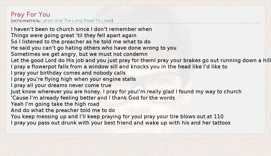Just know wherever you are honey, I pray for youI'm really glad I found my way to church