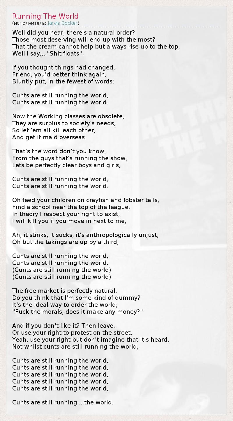 Well did you hear, there's a natural order? Those most deserving will end up with the most? That the cream cannot help but always rise up to the top, Well I say,..."Shit floats". If you thought things had changed, Friend, you'd better think again, Bluntly put, in the fewest of words: Cunts are still running the world, Cunts are still running the world. Now the Working classes are obsolete, They are surplus to society's needs, So let 'em all kill each other, And get it maid overseas. That's the word don't you know, From the guys that's running the show, Lets be perfectly clear boys and girls, Cunts are still running the world, Cunts are still running the world. Oh feed your children on crayfish and lobster tails, Find a school near the top of the league, In theory I respect your right to exist, I will kill you if you move in next to me, Ah, it stinks, it sucks, it's anthropologically unjust, Oh but the takings are up by a third, Cunts are still running the world, Cunts are still running the world. (Cunts are still running the world) (Cunts are still running the world) The free market is perfectly natural, Do you think that I'm some kind of dummy? It's the ideal way to order the world; "Fuck the morals, does it make any money?" And if you don't like it? Then leave. Or use your right to protest on the street, Yeah, use your right but don't imagine that it's heard, Not whilst cunts are still running the world, Cunts are still running the world, Cunts are still running the world, Cunts are still running the world, Cunts are still running the world, Cunts are still running the world, Cunts are still running... the world.