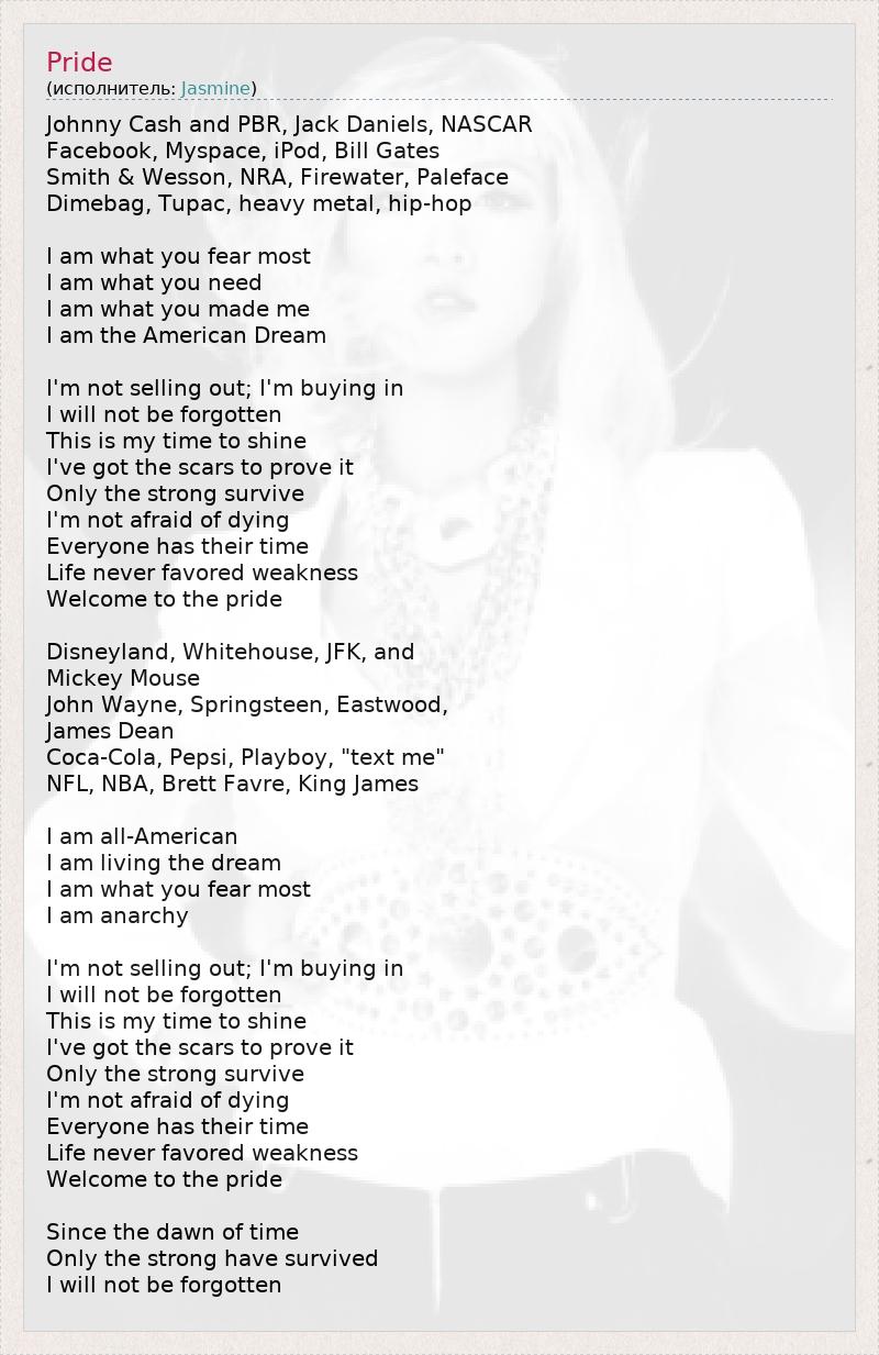 Johnny Cash and PBR, Jack Daniels, NASCAR Facebook, Myspace, iPod, Bill Gates Smith & Wesson, NRA, Firewater, Paleface Dimebag, Tupac, heavy metal, hip-hop I am what you fear most I am what you need I am what you made me I am the American Dream I'm not selling out; I'm buying in I will not be forgotten This is my time to shine I've got the scars to prove it Only the strong survive I'm not afraid of dying Everyone has their time Life never favored weakness Welcome to the pride Disneyland, Whitehouse, JFK, and Mickey Mouse John Wayne, Springsteen, Eastwood, James Dean Coca-Cola, Pepsi, Playboy, "text me" NFL, NBA, Brett Favre, King James I am all-American I am living the dream I am what you fear most I am anarchy I'm not selling out; I'm buying in I will not be forgotten This is my time to shine I've got the scars to prove it Only the strong survive I'm not afraid of dying Everyone has their time Life never favored weakness Welcome to the pride Since the dawn of time Only the strong have survived I will not be forgotten