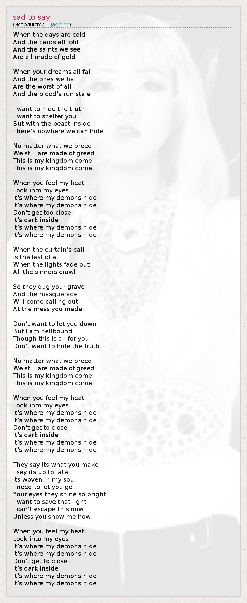 When the days are cold And the cards all fold And the saints we see Are all made of gold When your dreams all fail And the ones we hail Are the worst of all And the blood's run stale I want to hide the truth I want to shelter you But with the beast inside There's nowhere we can hide No matter what we breed We still are made of greed This is my kingdom come This is my kingdom come When you feel my heat Look into my eyes It's where my demons hide It's where my demons hide Don't get too close It's dark inside It's where my demons hide It's where my demons hide When the curtain's call Is the last of all When the lights fade out All the sinners crawl So they dug your grave And the masquerade Will come calling out At the mess you made Don't want to let you down But I am hellbound Though this is all for you Don't want to hide the truth No matter what we breed We still are made of greed This is my kingdom come This is my kingdom come When you feel my heat Look into my eyes It's where my demons hide It's where my demons hide Don't get to close It's dark inside It's where my demons hide It's where my demons hide They say its what you make I say its up to fate Its woven in my soul I need to let you go Your eyes they shine so bright I want to save that light I can't escape this now Unless you show me how When you feel my heat Look into my eyes It's where my demons hide It's where my demons hide Don't get to close It's dark inside It's where my demons hide It's where my demons hide