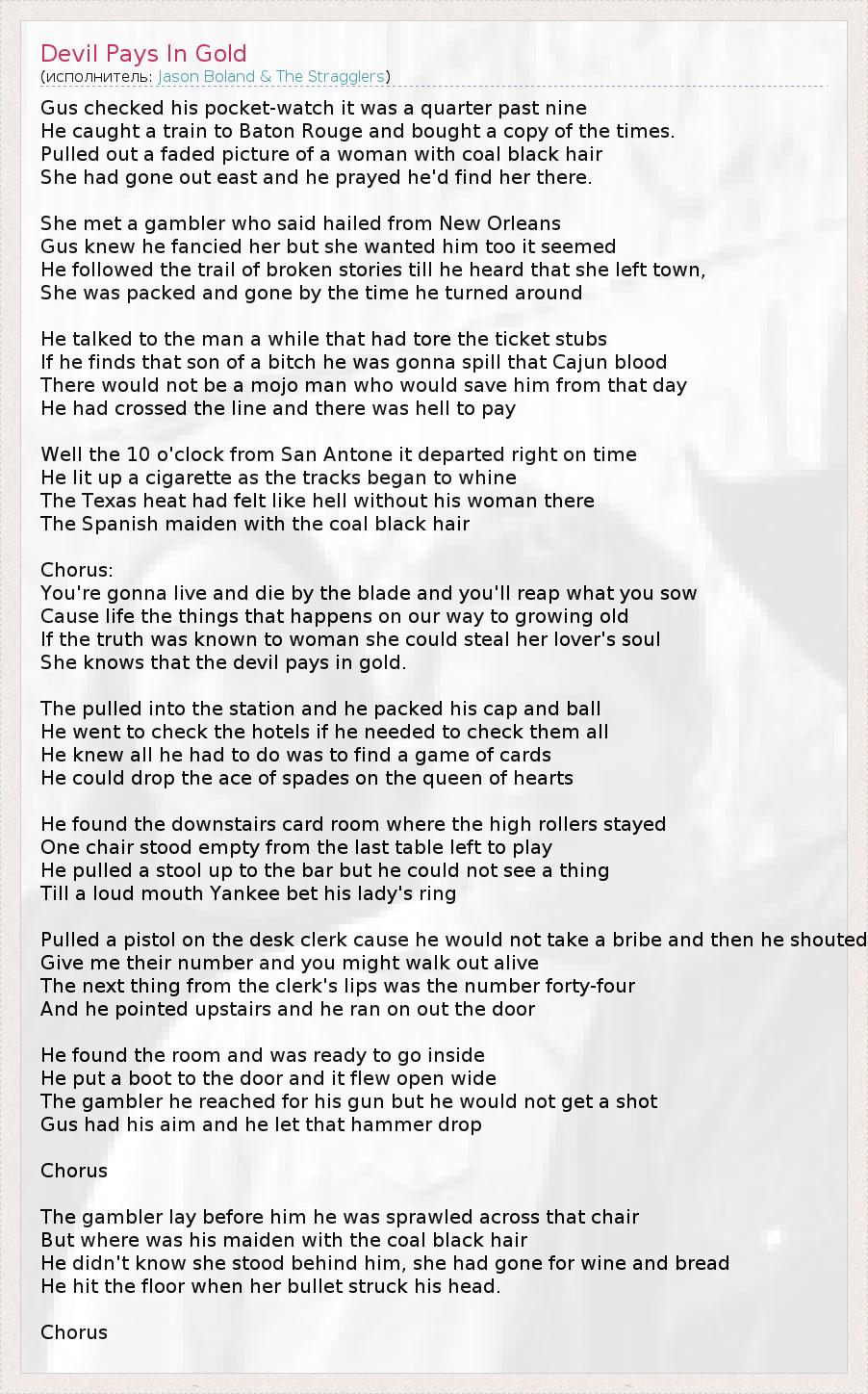А как ты думаешь, о чем песня "Devil Pays In Gold" ?