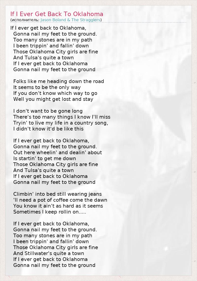 If I ever get back to Oklahoma, Gonna nail my feet to the ground. Too many stones are in my path I been trippin' and fallin' down Those Oklahoma City girls are fine And Tulsa's quite a town If I ever get back to Oklahoma Gonna nail my feet to the ground Folks like me heading down the road It seems to be the only way If you don't know which way to go Well you might get lost and stay I don't want to be gone long There's too many things I know I'll miss Tryin' to live my life in a country song, I didn't know it'd be like this If I ever get back to Oklahoma, Gonna nail my feet to the ground. Out here wheelin' and dealin' about Is startin' to get me down Those Oklahoma City girls are fine And Tulsa's quite a town If I ever get back to Oklahoma Gonna nail my feet to the ground Climbin' into bed still wearing jeans 'll need a pot of coffee come the dawn You know it ain't as hard as it seems Sometimes I keep rollin on..... If I ever get back to Oklahoma, Gonna nail my feet to the ground. Too many stones are in my path I been trippin' and fallin' down Those Oklahoma City girls are fine And Stillwater's quite a town If I ever get back to Oklahoma Gonna nail my feet to the ground