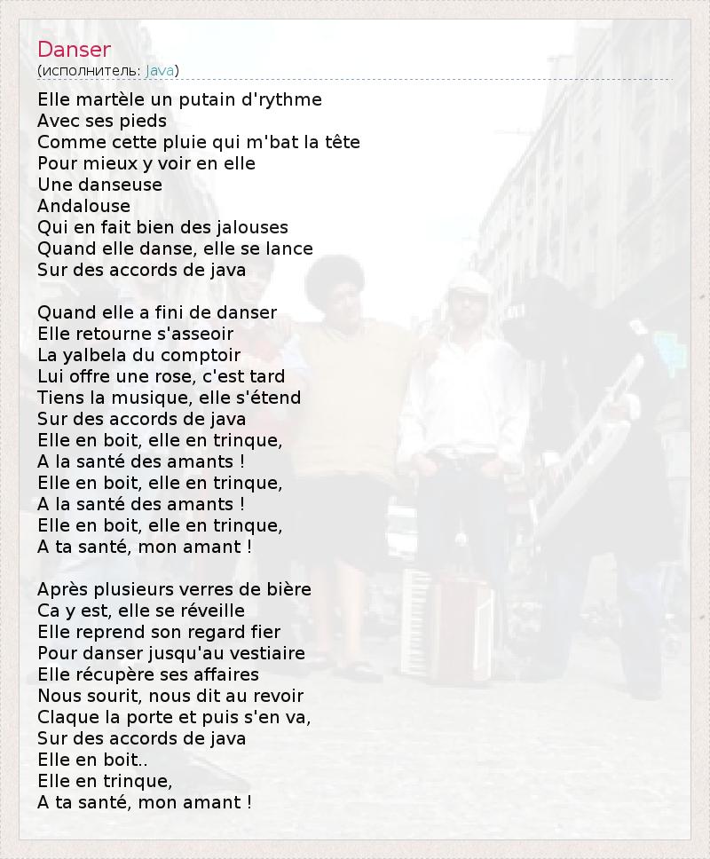 Elle martèle un putain d'rythme Avec ses pieds Comme cette pluie qui m'bat la tête Pour mieux y voir en elle Une danseuse Andalouse Qui en fait bien des jalouses Quand elle danse, elle se lance Sur des accords de java Quand elle a fini de danser Elle retourne s'asseoir La yalbela du comptoir Lui offre une rose, c'est tard Tiens la musique, elle s'étend Sur des accords de java Elle en boit, elle en trinque, A la santé des amants ! Elle en boit, elle en trinque, A la santé des amants ! Elle en boit, elle en trinque, A ta santé, mon amant ! Après plusieurs verres de bière Ca y est, elle se réveille Elle reprend son regard fier Pour danser jusqu'au vestiaire Elle récupère ses affaires Nous sourit, nous dit au revoir Claque la porte et puis s'en va, Sur des accords de java Elle en boit.. Elle en trinque, A ta santé, mon amant !