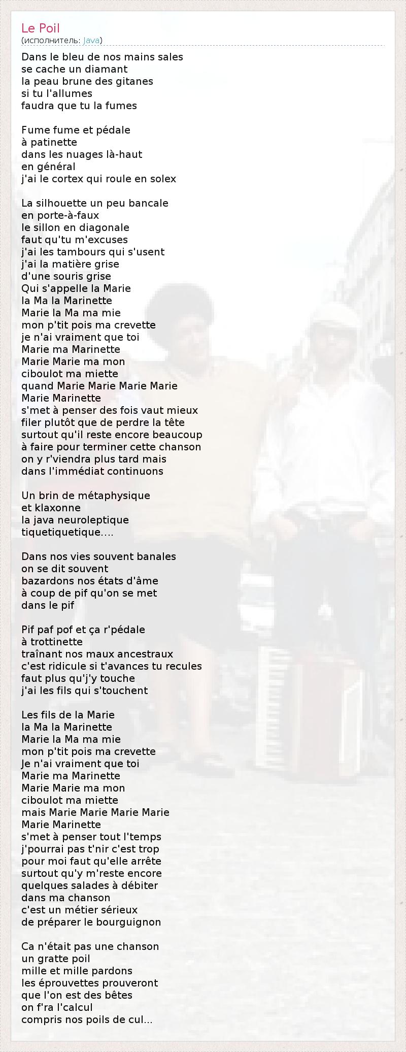 Dans продаж Le Bleu де NOS сетевые себе кэш ООН Диамант ла Peau Брюн де Gitanes си ту l' allumes faudra Que Tu -ля пары Дым дым и др Pedale à patinette данс ле Nuages La- Haut ан général j'ai ле кора Квай Roule ан Solex La силуэт ООН ПЭУ bancale ан порте - à - искусственного Сийон ан Diagonale Faut qu'tu m'excuses j'ai ле тамбуры Квай s'usent j'ai ла matière кардиналом d' Une Саурис кардиналом Квай s'appelle ла Мари ла Ма -ла- Marinette Мари -ла- Ма Ма Ми пн p'tit пои ма Crevette JE n'ai Vraiment Que тои Мари ма Marinette Мари Мари ма пн ciboulot ма Miette Quand Мари Мари Мари Мари Мари Marinette s'met à раздатчика де фуа Vaut MIEUX фильтром plutôt Que де perdre ла тет сюртуке qu'il Reste бис боку à свободной конкуренции залить Terminer Сет шансон на у r'viendra плюс TARD Mais Dans l' immédiat continuons Un Брин де métaphysique ET klaxonne ла Java neuroleptique tiquetiquetique ... . Dans NOS соперничает souvent banales на себе дит souvent bazardons NOS États d' âme переворот де PIF qu'on себе встретился данс ле PIF Пиф паф ФОМ др ça r'pédale à trottinette traînant NOS Maux ancestraux c'est насмешки си t'avances Ту recules Faut плюс qu'j'y Туш j'ai ле -сын Квай s'touchent Les -сын -де-ла Мари ла Ма -ла- Marinette Мари -ла- Ма Ма Ми пн p'tit пои ма Crevette Je n'ai Vraiment Que тои Мари ма Marinette Мари Мари ма пн ciboulot ма Miette МАИС Мари Мари Мари Мари Мари Marinette s'met à раздатчика зазывают l' секретари j'pourrai па t'nir c'est Троп залить Moi Faut qu'elle arrête сюртуке qu'y m'reste бис Quelques Salades à débiter данс ма шансон c'est ООН Metier sérieux де Preparer ле -бургундски Ca n'était па Une шансон ООН gratte Poil Mille др Mille помилование ле éprouvettes prouveront Que l' на оц де Betes на f'ra l' Calcul КОМПРИС NOS poils де куль ...