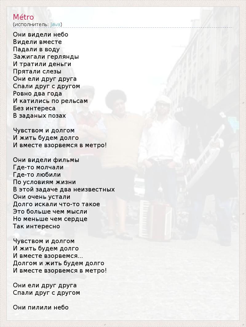 Они видели небо Видели вместе Падали в воду Зажигали герлянды И тратили деньги Прятали слезы Они ели друг друга Спали друг с другом Ровно два года И катились по рельсам Без интереса В заданых позах Чувством и долгом И жить будем долго И вместе взорвемся в метро! Они видели фильмы Где-то молчали Где-то любили По условиям жизни В этой задаче два неизвестных Они очень устали Долго искали что-то такое Это больше чем мысли Но меньше чем сердце Так интересно Чувством и долгом И жить будем долго И вместе взорвемся... Долгом и жить будем долго И вместе взорвемся в метро! Они ели друг друга Спали друг с другом Они пилили небо