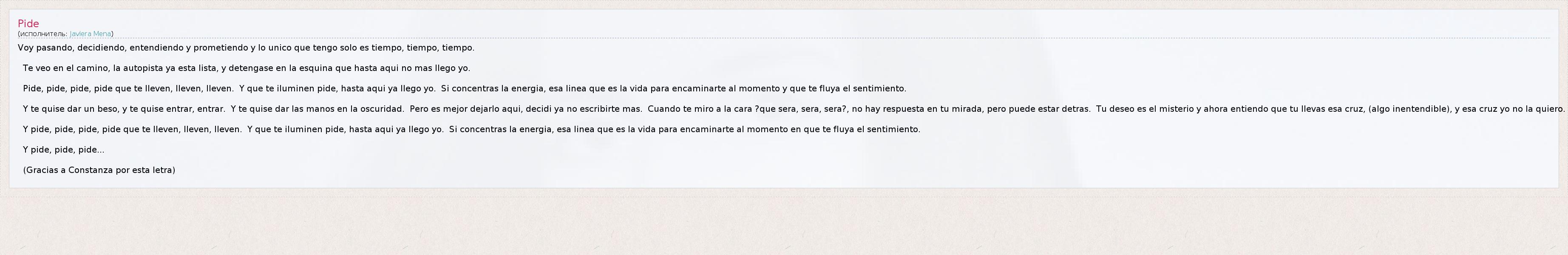 Voy pasando, decidiendo, entendiendo y prometiendo y lo unico que tengo solo es tiempo, tiempo, tiempo. Te veo en el camino, la autopista ya esta lista, y detengase en la esquina que hasta aqui no mas llego yo. Pide, pide, pide, pide que te lleven, lleven, lleven. Y que te iluminen pide, hasta aqui ya llego yo. Si concentras la energia, esa linea que es la vida para encaminarte al momento y que te fluya el sentimiento. Y te quise dar un beso, y te quise entrar, entrar. Y te quise dar las manos en la oscuridad. Pero es mejor dejarlo aqui, decidi ya no escribirte mas. Cuando te miro a la cara ?que sera, sera, sera?, no hay respuesta en tu mirada, pero puede estar detras. Tu deseo es el misterio y ahora entiendo que tu llevas esa cruz, (algo inentendible), y esa cruz yo no la quiero. Y pide, pide, pide, pide que te lleven, lleven, lleven. Y que te iluminen pide, hasta aqui ya llego yo. Si concentras la energia, esa linea que es la vida para encaminarte al momento en que te fluya el sentimiento. Y pide, pide, pide... (Gracias a Constanza por esta letra)