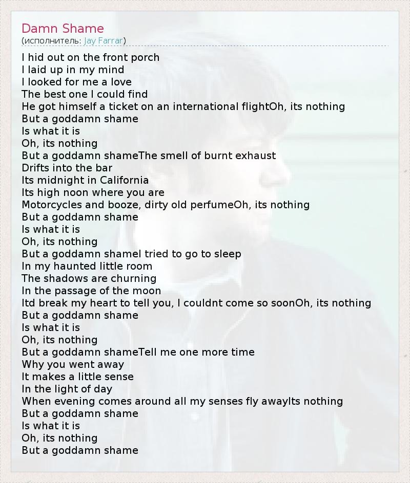 I hid out on the front porch I laid up in my mind I looked for me a love The best one I could find He got himself a ticket on an international flightOh, its nothing But a goddamn shame Is what it is Oh, its nothing But a goddamn shameThe smell of burnt exhaust Drifts into the bar Its midnight in California Its high noon where you are Motorcycles and booze, dirty old perfumeOh, its nothing But a goddamn shame Is what it is Oh, its nothing But a goddamn shameI tried to go to sleep In my haunted little room The shadows are churning In the passage of the moon Itd break my heart to tell you, I couldnt come so soonOh, its nothing But a goddamn shame Is what it is Oh, its nothing But a goddamn shameTell me one more time Why you went away It makes a little sense In the light of day When evening comes around all my senses fly awayIts nothing But a goddamn shame Is what it is Oh, its nothing But a goddamn shame