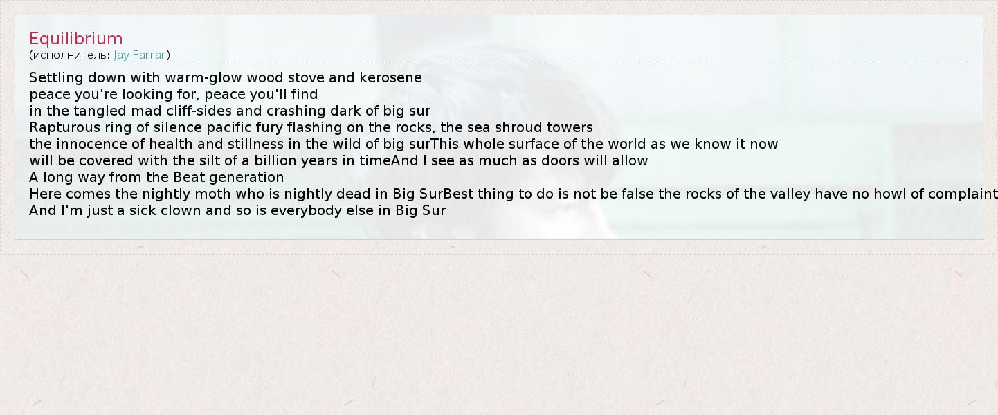 Settling down with warm-glow wood stove and kerosene peace you're looking for, peace you'll find in the tangled mad cliff-sides and crashing dark of big sur Rapturous ring of silence pacific fury flashing on the rocks, the sea shroud towers the innocence of health and stillness in the wild of big surThis whole surface of the world as we know it now will be covered with the silt of a billion years in timeAnd I see as much as doors will allow A long way from the Beat generation Here comes the nightly moth who is nightly dead in Big SurBest thing to do is not be false the rocks of the valley have no howl of complaint And I'm just a sick clown and so is everybody else in Big Sur