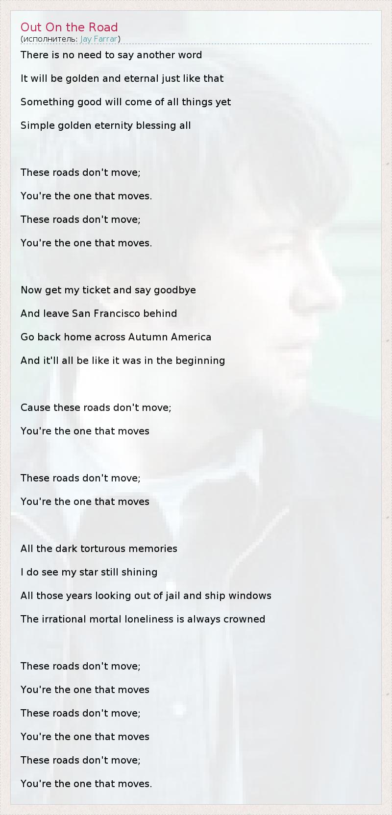 There is no need to say another word It will be golden and eternal just like that Something good will come of all things yet Simple golden eternity blessing all These roads don't move; You're the one that moves. These roads don't move; You're the one that moves. Now get my ticket and say goodbye And leave San Francisco behind Go back home across Autumn America And it'll all be like it was in the beginning Cause these roads don't move; You're the one that moves These roads don't move; You're the one that moves All the dark torturous memories I do see my star still shining All those years looking out of jail and ship windows The irrational mortal loneliness is always crowned These roads don't move; You're the one that moves These roads don't move; You're the one that moves These roads don't move; You're the one that moves.