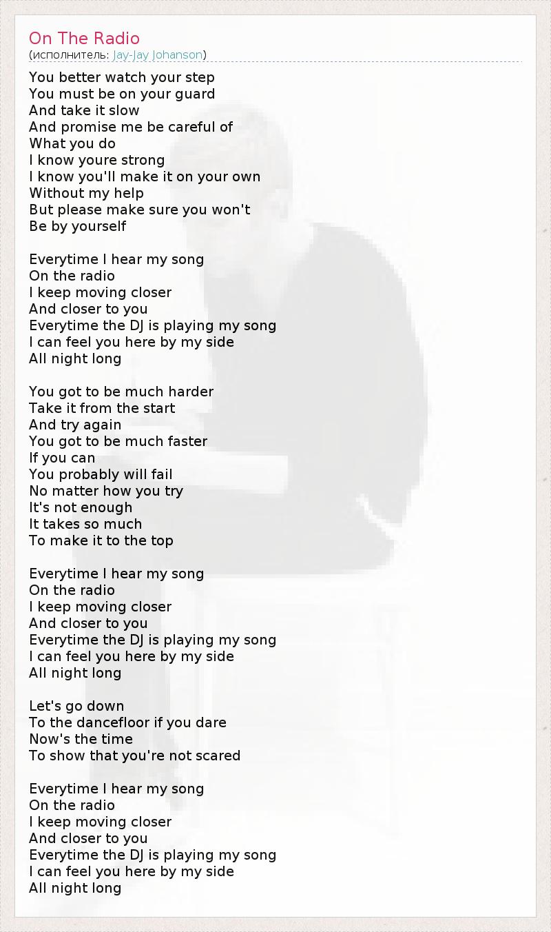 Следи за собой, Будь осторожна, Не спеши. И пообещай мне быть осторожной В том, что ты делаешь. Я знаю, ты сильная, Я знаю, ты справишься сама, Без моей помощи, Но обещай, что ты не будешь Предоставлена сама себе. Каждый раз, когда я слышу свою песню По радио Я продолжаю двигаться все ближе И ближе к тебе. Каждый раз, когда диджей играет мою песню, Я чувствую тебя со мной рядом Всю ночь напролет. Ты должна быть упорней - Бери новый старт И пытайся снова. Ты должна быть намного быстрее, Если можешь. Возможно, ты потерпишь неудачу, Как бы ты ни старалась, Этого все равно недостаточно. Нужно отдать многое, Чтобы достичь вершины. Каждый раз, когда я слышу свою песню По радио Я продолжаю двигаться все ближе И ближе к тебе. Каждый раз, когда диджей играет мою песню, Я чувствую тебя со мной рядом Всю ночь напролет. Давай спустимся На танцпол, если ты осмелишься. Настало время Показать, что ты не боишься. Каждый раз, когда я слышу свою песню По радио Я продолжаю двигаться все ближе И ближе к тебе. Каждый раз, когда диджей играет мою песню, Я чувствую тебя со мной рядом Всю ночь напролет.