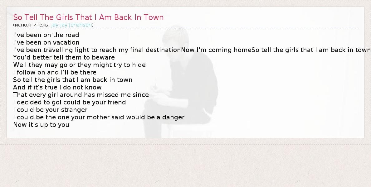 ГлавнаяИсполнителиJay-Jay JohansonSo Tell The Girls That I Am Back In Town