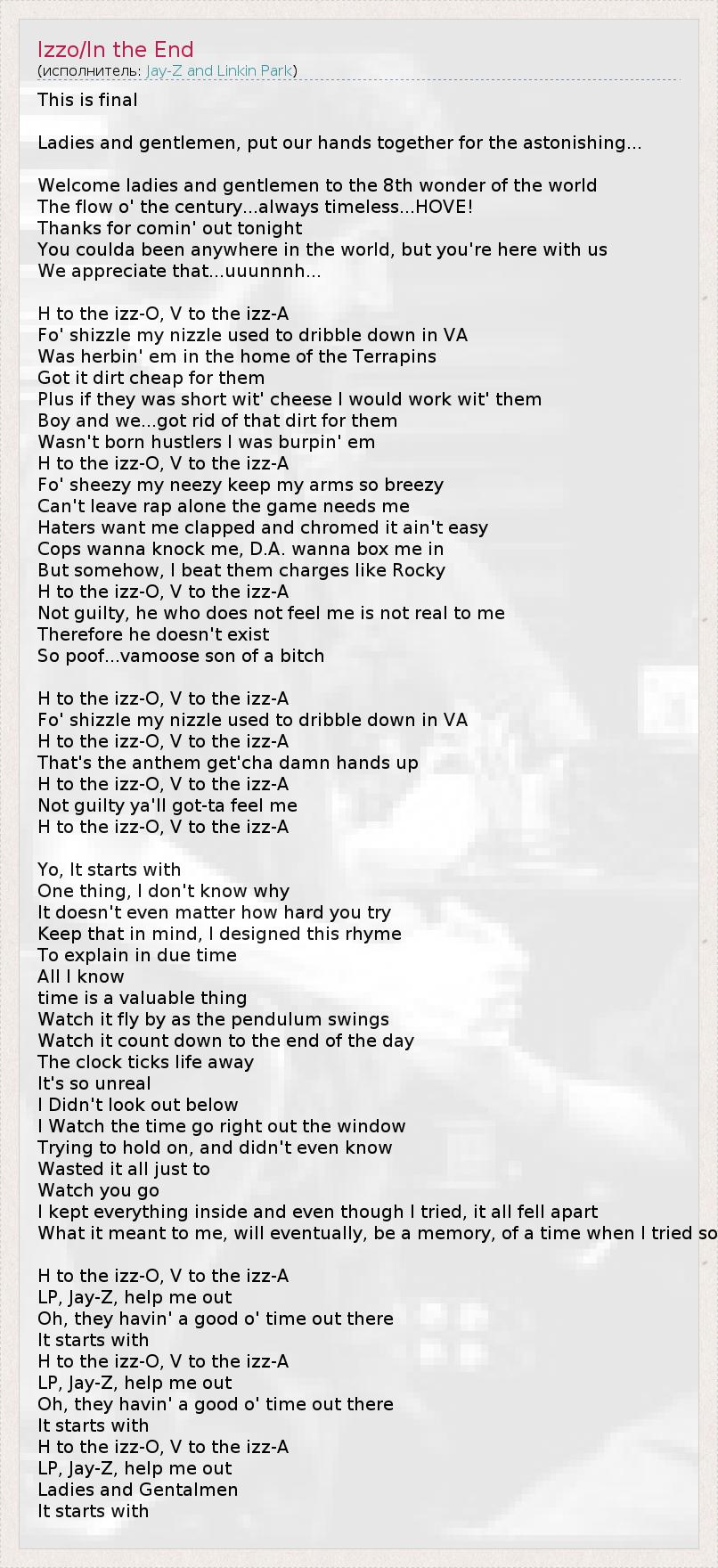 This is final Ladies and gentlemen, put our hands together for the astonishing... Welcome ladies and gentlemen to the 8th wonder of the world The flow o' the century...always timeless...HOVE! Thanks for comin' out tonight You coulda been anywhere in the world, but you're here with us We appreciate that...uuunnnh... H to the izz-O, V to the izz-A Fo' shizzle my nizzle used to dribble down in VA Was herbin' em in the home of the Terrapins Got it dirt cheap for them Plus if they was short wit' cheese I would work wit' them Boy and we...got rid of that dirt for them Wasn't born hustlers I was burpin' em H to the izz-O, V to the izz-A Fo' sheezy my neezy keep my arms so breezy Can't leave rap alone the game needs me Haters want me clapped and chromed it ain't easy Cops wanna knock me, D.A. wanna box me in But somehow, I beat them charges like Rocky H to the izz-O, V to the izz-A Not guilty, he who does not feel me is not real to me Therefore he doesn't exist So poof...vamoose son of a bitch H to the izz-O, V to the izz-A Fo' shizzle my nizzle used to dribble down in VA H to the izz-O, V to the izz-A That's the anthem get'cha damn hands up H to the izz-O, V to the izz-A Not guilty ya'll got-ta feel me H to the izz-O, V to the izz-A Yo, It starts with One thing, I don't know why It doesn't even matter how hard you try Keep that in mind, I designed this rhyme To explain in due time All I know time is a valuable thing Watch it fly by as the pendulum swings Watch it count down to the end of the day The clock ticks life away It's so unreal I Didn't look out below I Watch the time go right out the window Trying to hold on, and didn't even know Wasted it all just to Watch you go I kept everything inside and even though I tried, it all fell apart What it meant to me, will eventually, be a memory, of a time when I tried so H to the izz-O, V to the izz-A LP, Jay-Z, help me out Oh, they havin' a good o' time out there It starts with H to the izz-O, V to the izz-A LP, Jay-Z, help me out Oh, they havin' a good o' time out there It starts with H to the izz-O, V to the izz-A LP, Jay-Z, help me out Ladies and Gentalmen It starts with
