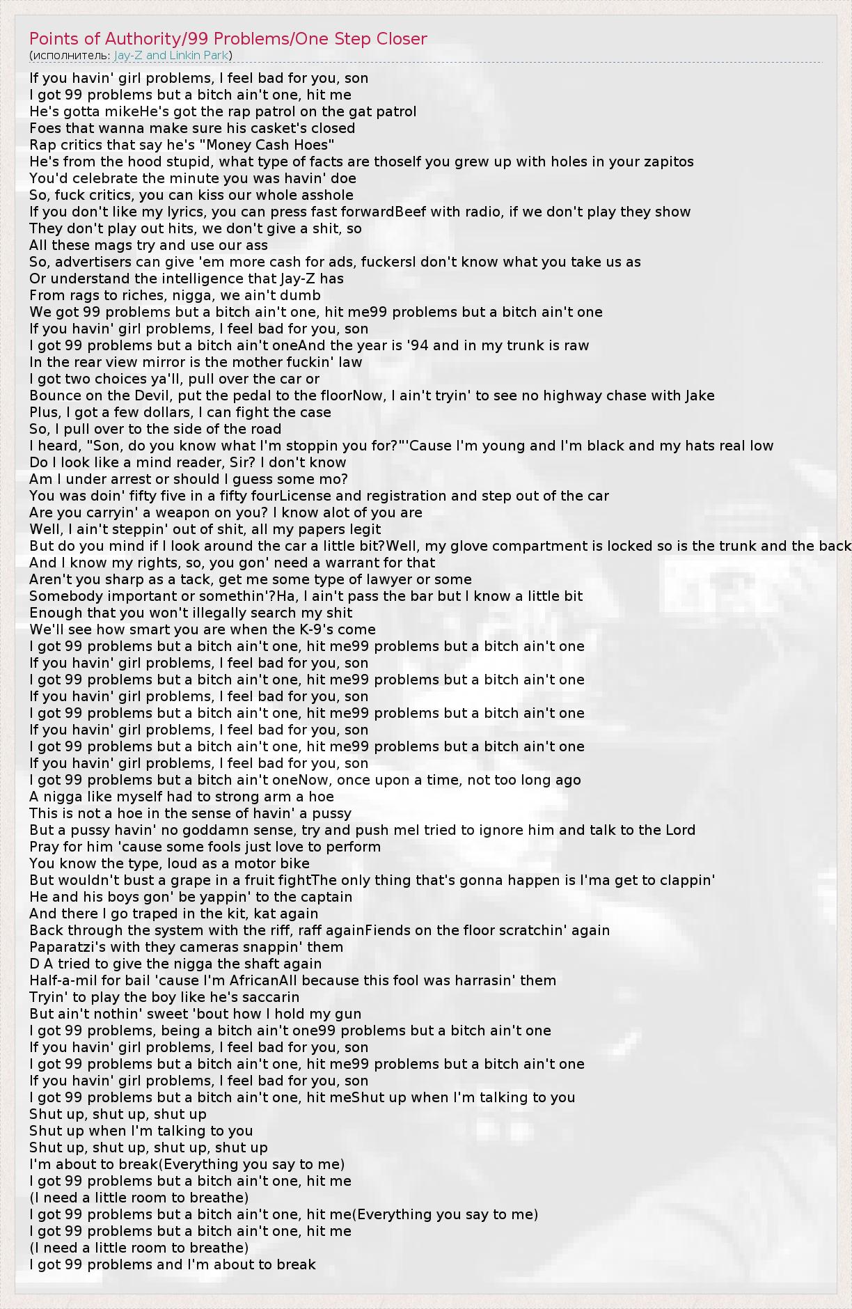 А как ты думаешь, о чем песня "Points of Authority/99 Problems/One Step Closer" ?