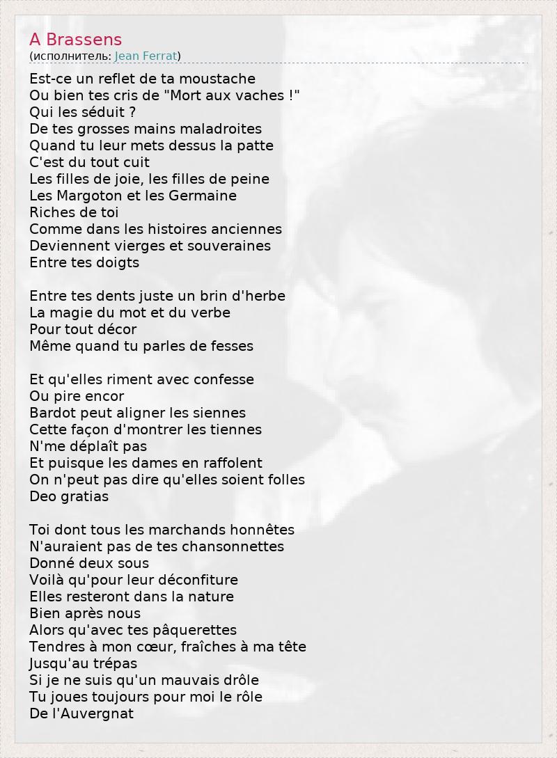 Это интересно:Жан Тененбаум, более известный почитателям французской музыки, как Жан Ферра, родился в Вокрессоне 26 декабря 1930 года, откуда его семья позже переехала в Версаль.Первые опыты музицирования Жана относятся к годам ранней юности. В начале 50х он вступил в театральную труппу, был принят гитаристом в джаз-банд и начал писать первые песни, предлагая их и другим исполнителям, в том числе Андре... продолжение