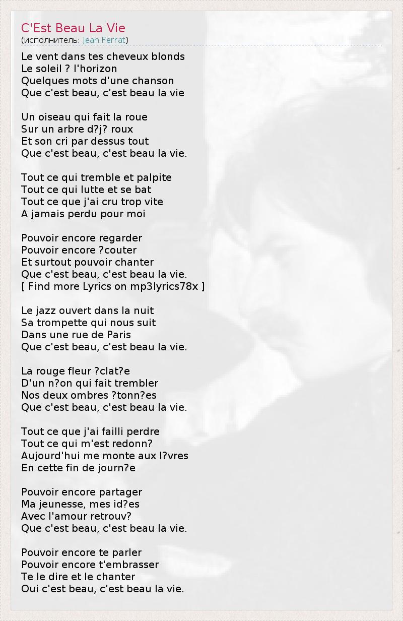 Le vent dans tes cheveux blonds Le soleil ? l'horizon Quelques mots d'une chanson Que c'est beau, c'est beau la vie Un oiseau qui fait la roue Sur un arbre d?j? roux Et son cri par dessus tout Que c'est beau, c'est beau la vie. Tout ce qui tremble et palpite Tout ce qui lutte et se bat Tout ce que j'ai cru trop vite A jamais perdu pour moi Pouvoir encore regarder Pouvoir encore ?couter Et surtout pouvoir chanter Que c'est beau, c'est beau la vie. [ Find more Lyrics on mp3lyrics78x ] Le jazz ouvert dans la nuit Sa trompette qui nous suit Dans une rue de Paris Que c'est beau, c'est beau la vie. La rouge fleur ?clat?e D'un n?on qui fait trembler Nos deux ombres ?tonn?es Que c'est beau, c'est beau la vie. Tout ce que j'ai failli perdre Tout ce qui m'est redonn? Aujourd'hui me monte aux l?vres En cette fin de journ?e Pouvoir encore partager Ma jeunesse, mes id?es Avec l'amour retrouv? Que c'est beau, c'est beau la vie. Pouvoir encore te parler Pouvoir encore t'embrasser Te le dire et le chanter Oui c'est beau, c'est beau la vie.