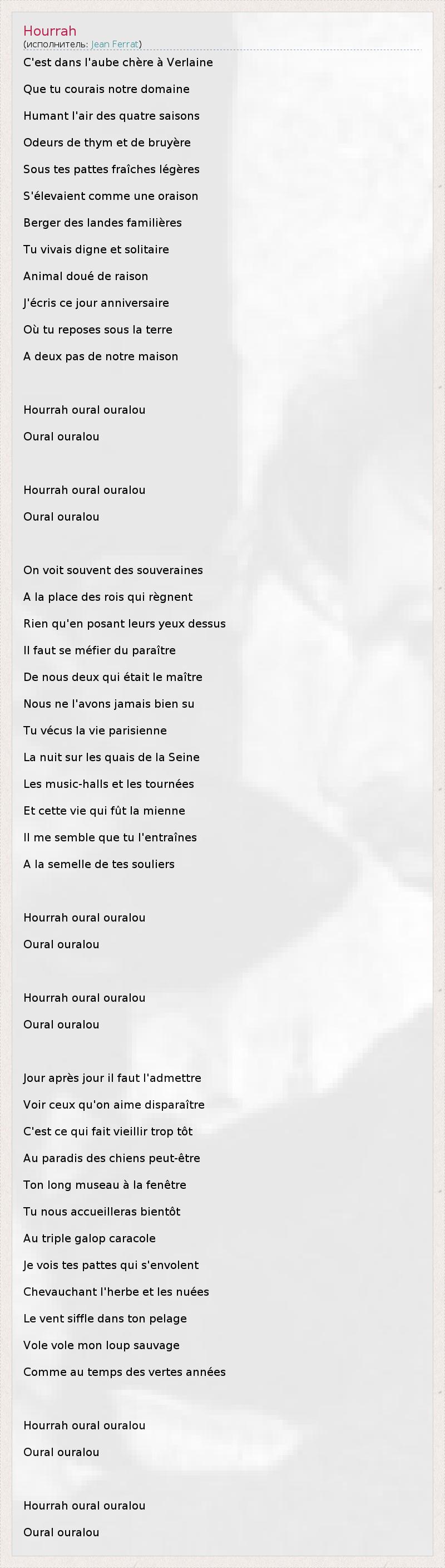Это интересно:Жан Тененбаум, более известный почитателям французской музыки, как Жан Ферра, родился в Вокрессоне 26 декабря 1930 года, откуда его семья позже переехала в Версаль.Первые опыты музицирования Жана относятся к годам ранней юности. В начале 50х он вступил в театральную труппу, был принят гитаристом в джаз-банд и начал писать первые песни, предлагая их и другим исполнителям, в том числе Андре... продолжение