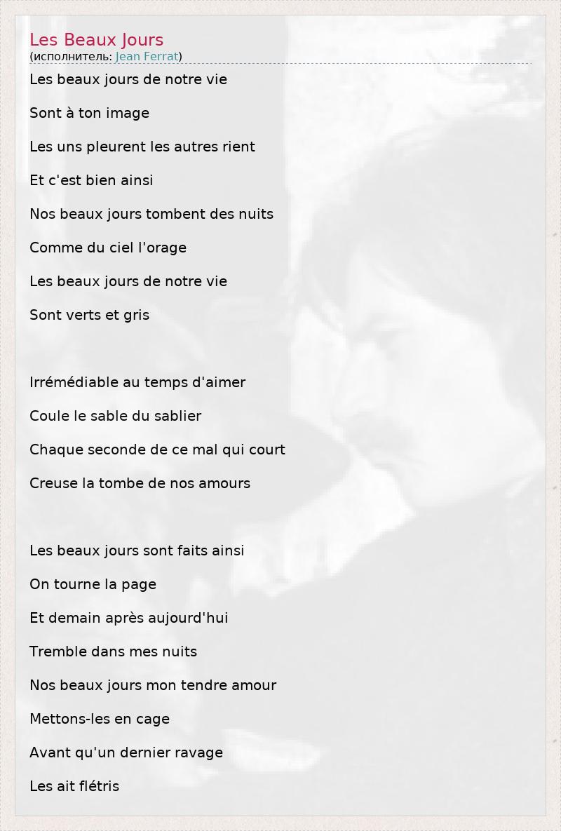 Les beaux jours de notre vie Sont à ton image Les uns pleurent les autres rient Et c'est bien ainsi Nos beaux jours tombent des nuits Comme du ciel l'orage Les beaux jours de notre vie Sont verts et gris Irrémédiable au temps d'aimer Coule le sable du sablier Chaque seconde de ce mal qui court Creuse la tombe de nos amours Les beaux jours sont faits ainsi On tourne la page Et demain après aujourd'hui Tremble dans mes nuits Nos beaux jours mon tendre amour Mettons-les en cage Avant qu'un dernier ravage Les ait flétris