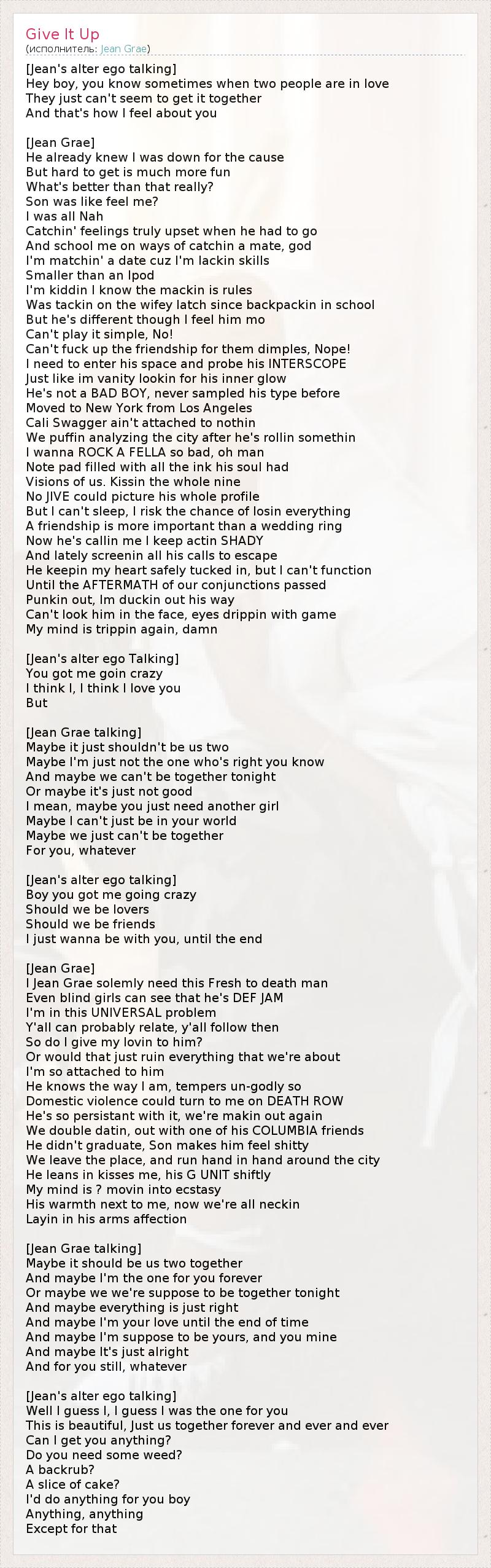 [Jean's alter ego talking] Hey boy, you know sometimes when two people are in love They just can't seem to get it together And that's how I feel about you [Jean Grae] He already knew I was down for the cause But hard to get is much more fun What's better than that really? Son was like feel me? I was all Nah Catchin' feelings truly upset when he had to go And school me on ways of catchin a mate, god I'm matchin' a date cuz I'm lackin skills Smaller than an Ipod I'm kiddin I know the mackin is rules Was tackin on the wifey latch since backpackin in school But he's different though I feel him mo Can't play it simple, No! Can't fuck up the friendship for them dimples, Nope! I need to enter his space and probe his INTERSCOPE Just like im vanity lookin for his inner glow He's not a BAD BOY, never sampled his type before Moved to New York from Los Angeles Cali Swagger ain't attached to nothin We puffin analyzing the city after he's rollin somethin I wanna ROCK A FELLA so bad, oh man Note pad filled with all the ink his soul had Visions of us. Kissin the whole nine No JIVE could picture his whole profile But I can't sleep, I risk the chance of losin everything A friendship is more important than a wedding ring Now he's callin me I keep actin SHADY And lately screenin all his calls to escape He keepin my heart safely tucked in, but I can't function Until the AFTERMATH of our conjunctions passed Punkin out, Im duckin out his way Can't look him in the face, eyes drippin with game My mind is trippin again, damn [Jean's alter ego Talking] You got me goin crazy I think I, I think I love you But [Jean Grae talking] Maybe it just shouldn't be us two Maybe I'm just not the one who's right you know And maybe we can't be together tonight Or maybe it's just not good I mean, maybe you just need another girl Maybe I can't just be in your world Maybe we just can't be together For you, whatever [Jean's alter ego talking] Boy you got me going crazy Should we be lovers Should we be friends I just wanna be with you, until the end [Jean Grae] I Jean Grae solemly need this Fresh to death man Even blind girls can see that he's DEF JAM I'm in this UNIVERSAL problem Y'all can probably relate, y'all follow then So do I give my lovin to him? Or would that just ruin everything that we're about I'm so attached to him He knows the way I am, tempers un-godly so Domestic violence could turn to me on DEATH ROW He's so persistant with it, we're makin out again We double datin, out with one of his COLUMBIA friends He didn't graduate, Son makes him feel shitty We leave the place, and run hand in hand around the city He leans in kisses me, his G UNIT shiftly My mind is ? movin into ecstasy His warmth next to me, now we're all neckin Layin in his arms affection [Jean Grae talking] Maybe it should be us two together And maybe I'm the one for you forever Or maybe we we're suppose to be together tonight And maybe everything is just right And maybe I'm your love until the end of time And maybe I'm suppose to be yours, and you mine And maybe It's just alright And for you still, whatever [Jean's alter ego talking] Well I guess I, I guess I was the one for you This is beautiful, Just us together forever and ever and ever Can I get you anything? Do you need some weed? A backrub? A slice of cake? I'd do anything for you boy Anything, anything Except for that