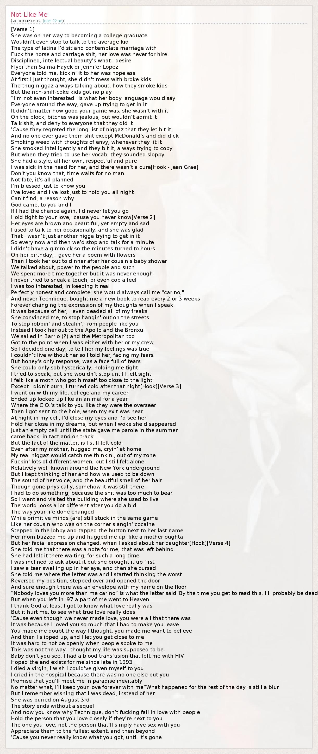 [Verse 1] She was on her way to becoming a college graduate Wouldn't even stop to talk to the average kid The type of latina I'd sit and contemplate marriage with Fuck the horse and carriage shit, her love was never for hire Disciplined, intellectual beauty's what I desire Flyer than Salma Hayek or Jennifer Lopez Everyone told me, kickin' it to her was hopeless At first I just thought, she didn't mess with broke kids The thug niggaz always talking about, how they smoke kids But the rich-sniff-coke kids got no play "I'm not even interested" is what her body language would say Everyone around the way, gave up trying to get in it It didn't matter how good your game was, she wasn't with it On the block, bitches was jealous, but wouldn't admit it Talk shit, and deny to everyone that they did it 'Cause they regreted the long list of niggaz that they let hit it And no one ever gave them shit except McDonald's and did-dick Smoking weed with thoughts of envy, whenever they lit it She smoked intelligently and they bit it, always trying to copy But when they tried to use her vocab, they sounded sloppy She had a style, all her own, respectful and pure I was sick in the head for her, and there wasn't a cure[Hook - Jean Grae] Don't you know that, time waits for no man Not fate, it's all planned I'm blessed just to know you I've loved and I've lost just to hold you all night Can't find, a reason why God came, to you and I If I had the chance again, I'd never let you go Hold tight to your love, 'cause you never know[Verse 2] Her eyes are brown and beautiful, yet empty and sad I used to talk to her occasionally, and she was glad That I wasn't just another nigga trying to get in it So every now and then we'd stop and talk for a minute I didn't have a gimmick so the minutes turned to hours On her birthday, I gave her a poem with flowers Then I took her out to dinner after her cousin's baby shower We talked about, power to the people and such We spent more time together but it was never enough I never tried to sneak a touch, or even cop a feel I was too interested, in keeping it real Perfectly honest and complete, she would always call me "carino," And never Technique, bought me a new book to read every 2 or 3 weeks Forever changing the expression of my thoughts when I speak It was because of her, I even deaded all of my freaks She convinced me, to stop hangin' out on the streets To stop robbin' and stealin', from people like you Instead I took her out to the Apollo and the Bronxu We sailed in Barrio (?) and the Metropolitan too Got to the point when I was either with her or my crew So I decided one day, to tell her my feelings was true I couldn't live without her so I told her, facing my fears But honey's only response, was a face full of tears She could only sob hysterically, holding me tight I tried to speak, but she wouldn't stop until I left sight I felt like a moth who got himself too close to the light Except I didn't burn, I turned cold after that night[Hook][Verse 3] I went on with my life, college and my career Ended up locked up like an animal for a year Where the C.O.'s talk to you like they were the overseer Then I got sent to the hole, when my exit was near At night in my cell, I'd close my eyes and I'd see her Hold her close in my dreams, but when I woke she disappeared Just an empty cell until the state gave me parole in the summer came back, in tact and on track But the fact of the matter, is I still felt cold Even after my mother, hugged me, cryin' at home My real niggaz would catch me thinkin', out of my zone Fuckin' lots of different women, but I still felt alone Relatively well-known around the New York underground But I kept thinking of her and how we used to be down The sound of her voice, and the beautiful smell of her hair Though gone physically, somehow it was still there I had to do something, because the shit was too much to bear So I went and visited the building where she used to live The world looks a lot different after you do a bid The way your life done changed While primitive minds (are) still stuck in the same game Like her cousin who was on the corner slangin' cocaine Stepped in the lobby and tapped the button next to her last name Her mom buzzed me up and hugged me up, like a mother oughta But her facial expression changed, when I asked about her daughter[Hook][Verse 4] She told me that there was a note for me, that was left behind She had left it there waiting, for such a long time I was inclined to ask about it but she brought it up first I saw a tear swelling up in her eye, and then she cursed She told me where the letter was and I started thinking the worst Reversed my position, stepped over and opened the door And sure enough there was an envelope with my name on the floor "Nobody loves you more than me carino" is what the letter said"By the time you get to read this, I'll probably be dead But when you left in '97 a part of me went to Heaven I thank God at least I got to know what love really was But it hurt me, to see what true love really does 'Cause even though we never made love, you were all that there was It was because I loved you so much that I had to make you leave You made me doubt the way I thought, you made me want to believe And then I slipped up, and I let you get close to me It was hard to not be openly when people spoke to me This was not the way I thought my life was supposed to be Baby don't you see, I had a blood transfusion that left me with HIV Hoped the end exists for me since late in 1993 I died a virgin, I wish I could've given myself to you I cried in the hospital because there was no one else but you Promise that you'll meet me in paradise inevitably No matter what, I'll keep your love forever with me"What happened for the rest of the day is still a blur But I remember wishing that I was dead, instead of her She was buried on August 3rd The story ends without a sequel And now you know why Technique, don't fucking fall in love with people H