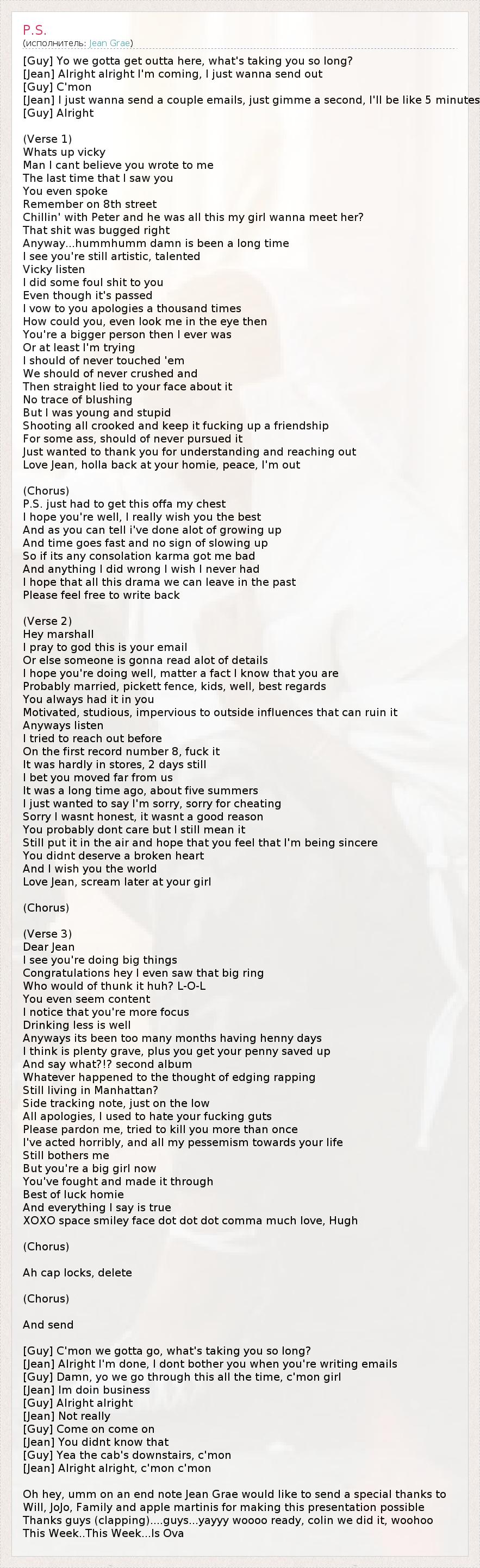 [Guy] Yo we gotta get outta here, what's taking you so long? [Jean] Alright alright I'm coming, I just wanna send out [Guy] C'mon [Jean] I just wanna send a couple emails, just gimme a second, I'll be like 5 minutes [Guy] Alright (Verse 1) Whats up vicky Man I cant believe you wrote to me The last time that I saw you You even spoke Remember on 8th street Chillin' with Peter and he was all this my girl wanna meet her? That shit was bugged right Anyway...hummhumm damn is been a long time I see you're still artistic, talented Vicky listen I did some foul shit to you Even though it's passed I vow to you apologies a thousand times How could you, even look me in the eye then You're a bigger person then I ever was Or at least I'm trying I should of never touched 'em We should of never crushed and Then straight lied to your face about it No trace of blushing But I was young and stupid Shooting all crooked and keep it fucking up a friendship For some ass, should of never pursued it Just wanted to thank you for understanding and reaching out Love Jean, holla back at your homie, peace, I'm out (Chorus) P.S. just had to get this offa my chest I hope you're well, I really wish you the best And as you can tell i've done alot of growing up And time goes fast and no sign of slowing up So if its any consolation karma got me bad And anything I did wrong I wish I never had I hope that all this drama we can leave in the past Please feel free to write back (Verse 2) Hey marshall I pray to god this is your email Or else someone is gonna read alot of details I hope you're doing well, matter a fact I know that you are Probably married, pickett fence, kids, well, best regards You always had it in you Motivated, studious, impervious to outside influences that can ruin it Anyways listen I tried to reach out before On the first record number 8, fuck it It was hardly in stores, 2 days still I bet you moved far from us It was a long time ago, about five summers I just wanted to say I'm sorry, sorry for cheating Sorry I wasnt honest, it wasnt a good reason You probably dont care but I still mean it Still put it in the air and hope that you feel that I'm being sincere You didnt deserve a broken heart And I wish you the world Love Jean, scream later at your girl (Chorus) (Verse 3) Dear Jean I see you're doing big things Congratulations hey I even saw that big ring Who would of thunk it huh? L-O-L You even seem content I notice that you're more focus Drinking less is well Anyways its been too many months having henny days I think is plenty grave, plus you get your penny saved up And say what?!? second album Whatever happened to the thought of edging rapping Still living in Manhattan? Side tracking note, just on the low All apologies, I used to hate your fucking guts Please pardon me, tried to kill you more than once I've acted horribly, and all my pessemism towards your life Still bothers me But you're a big girl now You've fought and made it through Best of luck homie And everything I say is true XOXO space smiley face dot dot dot comma much love, Hugh (Chorus) Ah cap locks, delete (Chorus) And send [Guy] C'mon we gotta go, what's taking you so long? [Jean] Alright I'm done, I dont bother you when you're writing emails [Guy] Damn, yo we go through this all the time, c'mon girl [Jean] Im doin business [Guy] Alright alright [Jean] Not really [Guy] Come on come on [Jean] You didnt know that [Guy] Yea the cab's downstairs, c'mon [Jean] Alright alright, c'mon c'mon Oh hey, umm on an end note Jean Grae would like to send a special thanks to Will, JoJo, Family and apple martinis for making this presentation possible Thanks guys (clapping)....guys...yayyy woooo ready, colin we did it, woohoo This Week..This Week...Is Ova