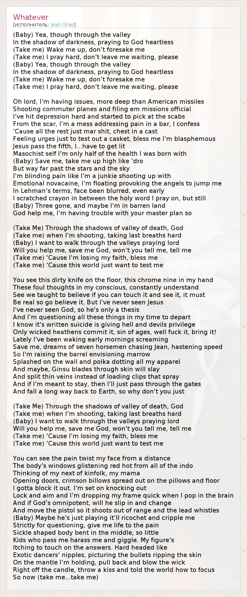 (Baby) Yea, though through the valley In the shadow of darkness, praying to God heartless (Take me) Wake me up, don't foresake me (Take me) I pray hard, don't leave me waiting, please (Baby) Yea, though through the valley In the shadow of darkness, praying to God heartless (Take me) Wake me up, don't foresake me (Take me) I pray hard, don't leave me waiting, please Oh lord, I'm having issues, more deep than American missiles Shooting commuter planes and filing em missions official I've hit depression hard and started to pick at the scabs From the scar, I'm a mess addressing pain in a bar, I confess 'Cause all the rest just mar shit, chest in a cast Feeling urges just to test out a casket, bless me I'm blasphemous Jesus pass the fifth, I...have to get lit Masochist self I'm only half of the health I was born with (Baby) Save me, take me up high like 'dro But way far past the stars and the sky I'm blinding pain like I'm a junkie shooting up with Emotional novacaine, I'm floating provoking the angels to jump me In Lehman's terms, face been blurred, even early I scratched crayon in between the holy word I pray on, but still (Baby) Three gone, and maybe I'm in barren land God help me, I'm having trouble with your master plan so (Take Me) Through the shadows of valley of death, God (Take me) when I'm shooting, taking last breaths hard (Baby) I want to walk through the valleys praying lord Will you help me, save me God, won't you tell me, tell me (Take me) 'Cause I'm losing my faith, bless me (Take me) 'Cause this world just want to test me You see this dirty knife on the floor, this chrome nine in my hand These foul thoughts in my conscious, constantly understand See we taught to believe if you can touch it and see it, it must Be real so go believe it. But I've never seen Jesus I've never seen God, so he's only a thesis And I'm questioning all these things in my time to depart I know it's written suicide is giving hell and devils privilege Only wicked heathens commit it, sin of ages, well fuck it, bring it! Lately I've been waking early mornings screaming Save me, dreams of seven horsemen chasing Jean, hastening speed So I'm raising the barrel envisioning marrow Splashed on the wall and polka dotting all my apparel And maybe, Ginsu blades through skin will slay And split thin veins instead of loading clips that spray And if I'm meant to stay, then I'll just pass through the gates And fall a long way back to Earth, so why don't you just (Take Me) Through the shadows of valley of death, God (Take me) when I'm shooting, taking last breaths hard (Baby) I want to walk through the valleys praying lord Will you help me, save me God, won't you tell me, tell me (Take me) 'Cause I'm losing my faith, bless me (Take me) 'Cause this world just want to test me You can see the pain twist my face from a distance The body's windows glistening red hot from all of the indo Thinking of my next of kinfolk, my mama Opening doors, crimson billows spread out on the pillows and floor I gotta block it out. I'm set on knocking out Lock and aim and I'm dropping my frame quick when I pop in the brain And if God's omnipotent, will he slip in and change And move the pistol so it shoots out of range and the lead whistles (Baby) Maybe he's just playing it'll ricochet and cripple me Strictly for questioning, give me life to the pain Sickle shaped body bent in the middle, so little Kids who pass me harass me and giggle. My figure's Itching to touch on the answers. Hard headed like Exotic dancers' nipples, picturing the bullets ripping the skin On the mantle I'm holding, pull back and blow the wick Right off the candle, throw a kiss and told the world how to focus So now (take me...take me)