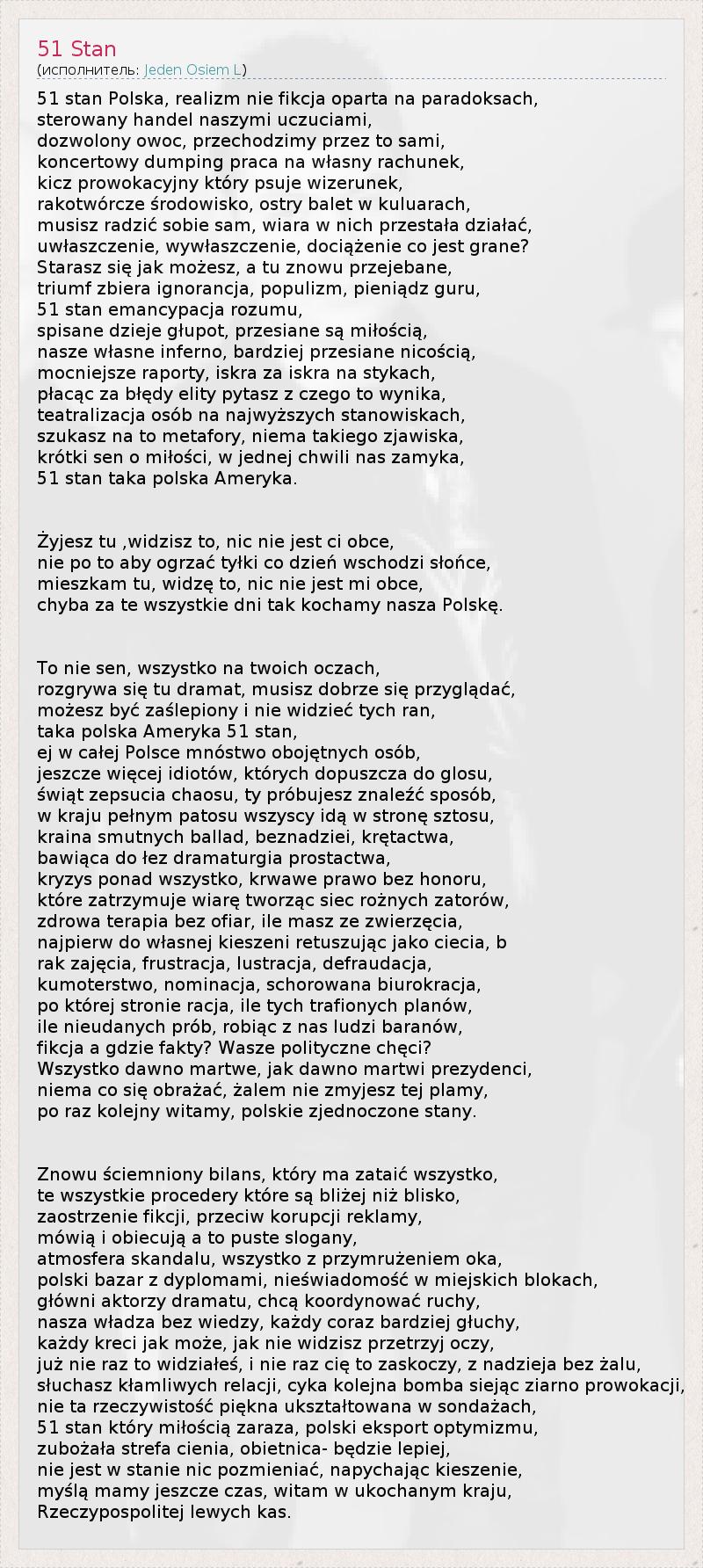 51 stan Polska, realizm nie fikcja oparta na paradoksach, sterowany handel naszymi uczuciami, dozwolony owoc, przechodzimy przez to sami, koncertowy dumping praca na własny rachunek, kicz prowokacyjny który psuje wizerunek, rakotwórcze środowisko, ostry balet w kuluarach, musisz radzić sobie sam, wiara w nich przestała działać, uwłaszczenie, wywłaszczenie, dociążenie co jest grane? Starasz się jak możesz, a tu znowu przejebane, triumf zbiera ignorancja, populizm, pieniądz guru, 51 stan emancypacja rozumu, spisane dzieje głupot, przesiane są miłością, nasze własne inferno, bardziej przesiane nicością, mocniejsze raporty, iskra za iskra na stykach, płacąc za błędy elity pytasz z czego to wynika, teatralizacja osób na najwyższych stanowiskach, szukasz na to metafory, niema takiego zjawiska, krótki sen o miłości, w jednej chwili nas zamyka, 51 stan taka polska Ameryka. Żyjesz tu ,widzisz to, nic nie jest ci obce, nie po to aby ogrzać tyłki co dzień wschodzi słońce, mieszkam tu, widzę to, nic nie jest mi obce, chyba za te wszystkie dni tak kochamy nasza Polskę. To nie sen, wszystko na twoich oczach, rozgrywa się tu dramat, musisz dobrze się przyglądać, możesz być zaślepiony i nie widzieć tych ran, taka polska Ameryka 51 stan, ej w całej Polsce mnóstwo obojętnych osób, jeszcze więcej idiotów, których dopuszcza do glosu, świąt zepsucia chaosu, ty próbujesz znaleźć sposób, w kraju pełnym patosu wszyscy idą w stronę sztosu, kraina smutnych ballad, beznadziei, krętactwa, bawiąca do łez dramaturgia prostactwa, kryzys ponad wszystko, krwawe prawo bez honoru, które zatrzymuje wiarę tworząc siec rożnych zatorów, zdrowa terapia bez ofiar, ile masz ze zwierzęcia, najpierw do własnej kieszeni retuszując jako ciecia, b rak zajęcia, frustracja, lustracja, defraudacja, kumoterstwo, nominacja, schorowana biurokracja, po której stronie racja, ile tych trafionych planów, ile nieudanych prób, robiąc z nas ludzi baranów, fikcja a gdzie fakty? Wasze polityczne chęci? Wszystko dawno martwe, jak dawno martwi prezydenci, niema co się obrażać, żalem nie zmyjesz tej plamy, po raz kolejny witamy, polskie zjednoczone stany. Znowu ściemniony bilans, który ma zataić wszystko, te wszystkie procedery które są bliżej niż blisko, zaostrzenie fikcji, przeciw korupcji reklamy, mówią i obiecują a to puste slogany, atmosfera skandalu, wszystko z przymrużeniem oka, polski bazar z dyplomami, nieświadomość w miejskich blokach, główni aktorzy dramatu, chcą koordynować ruchy, nasza władza bez wiedzy, każdy coraz bardziej głuchy, każdy kreci jak może, jak nie widzisz przetrzyj oczy, już nie raz to widziałeś, i nie raz cię to zaskoczy, z nadzieja bez żalu, słuchasz kłamliwych relacji, cyka kolejna bomba siejąc ziarno prowokacji, nie ta rzeczywistość piękna ukształtowana w sondażach, 51 stan który miłością zaraza, polski eksport optymizmu, zubożała strefa cienia, obietnica- będzie lepiej, nie jest w stanie nic pozmieniać, napychając kieszenie, myślą mamy jeszcze czas, witam w ukochanym kraju, Rzeczypospolitej lewych kas.