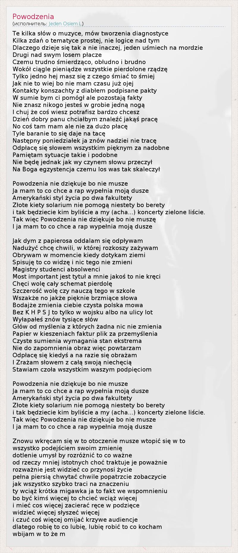 Te kilka słów o muzyce, mów tworzenia diagnostyce Kilka zdań o tematyce prostej, nie logice nad tym Dlaczego dzieje się tak a nie inaczej, jeden uśmiech na mordzie Drugi nad swym losem płacze Czemu trudno śmierdząco, obłudno i brudno Wokół ciągle pieniądze wszystkie pierdolone rządzę Tylko jedno hej masz się z czego śmiać to śmiej Jak nie to wiej bo nie mam czasu już ojej Kontakty konszachty z diabłem podpisane pakty W sumie bym ci pomógł ale pozostają fakty Nie znasz nikogo jesteś w grobie jedną nogą I chuj że coś wiesz potrafisz bardzo chcesz Dzień dobry panu chciałbym znaleźć jakąś pracę No coś tam mam ale nie za dużo płacę Tyle baranie to się daje na tacę Następny poniedziałek ja znów nadziei nie tracę Odpłacę się słowem wszystkim pięknym za nadobne Pamiętam sytuacje takie i podobne Nie będę jednak jak wy czynem słowu przeczył Na Boga egzystencja czemu los was tak skaleczył Powodzenia nie dziękuje bo nie musze Ja mam to co chce a rap wypełnia moją dusze Amerykański styl życia po dwa fakultety Złote kiety solarium nie pomogą niestety bo berety i tak będziecie kim byliście a my (acha...) koncerty zielone liście. Tak więc Powodzenia nie dziękuje bo nie muszę I ja mam to co chce a rap wypełnia moją dusze Jak dym z papierosa oddalam się odpływam Nadużyć chcę chwili, w której rozkoszy zażywam Obrywam w momencie kiedy dotykam ziemi Spisuję to co widzę i nic tego nie zmieni Magistry studenci absolwenci Most important jest tytuł a mnie jakoś to nie kręci Chęci wolę cały schemat pierdolę Szczerość wolę czy nauczą tego w szkole Wszakże no jakże pięknie brzmiące słowa Bodajże zmienia ciebie czysta polska mowa Bez K H P S J to tylko w wojsku albo na ulicy lot Wyłapałeś znów tysiące słów Głów od myślenia z których żadna nic nie zmienia Papier w kieszeniach faktur plik za przemyślenia Czyste sumienia wymagania stan ekstrema Nie do zapomnienia obraz więc powtarzam Odpłacę się kiedyś a na razie się obrażam I Zrażam słowem z całą swoją niechęcią Stawiam czoła wszystkim waszym podpięciom Powodzenia nie dziękuje bo nie musze Ja mam to co chce a rap wypełnia moją dusze Amerykański styl życia po dwa fakultety Złote kiety solarium nie pomogą niestety bo berety i tak będziecie kim byliście a my (acha...) koncerty zielone liście. Tak więc Powodzenia nie dziękuje bo nie musze I ja mam to co chce a rap wypełnia moją dusze Znowu wkręcam się w to otoczenie musze wtopić się w to wszystko podejściem swoim zmienię dotlenie umysł by rozróżnić to co ważne od rzeczy mniej istotnych choć traktuje je poważnie rozważnie jest widzieć co przynosi życie pełna piersią chwytać chwile popatrzcie zobaczycie jak wszystko szybko traci na znaczeniu ty wciąż krótka migawka ja to fakt we wspomnieniu bo być kimś więcej to chcieć wciąż więcej i mieć cos więcej zacierać ręce w podzięce widzieć więcej słyszeć więcej i czuć coś więcej omijać krzywe audiencje dlatego robię to co lubię, lubię robić to co kocham wbijam w to że m
