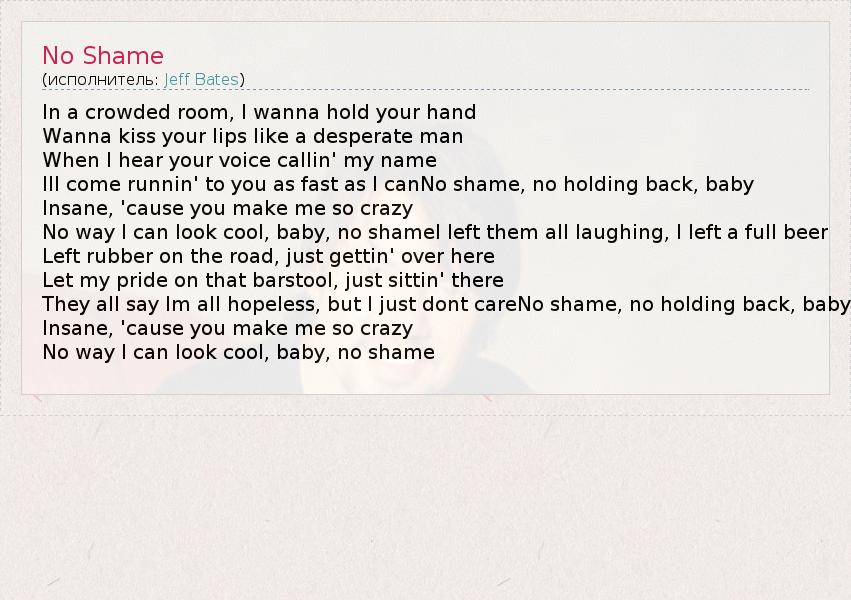 In a crowded room, I wanna hold your hand Wanna kiss your lips like a desperate man When I hear your voice callin' my name Ill come runnin' to you as fast as I canNo shame, no holding back, baby Insane, 'cause you make me so crazy No way I can look cool, baby, no shameI left them all laughing, I left a full beer Left rubber on the road, just gettin' over here Let my pride on that barstool, just sittin' there They all say Im all hopeless, but I just dont careNo shame, no holding back, baby Insane, 'cause you make me so crazy No way I can look cool, baby, no shame