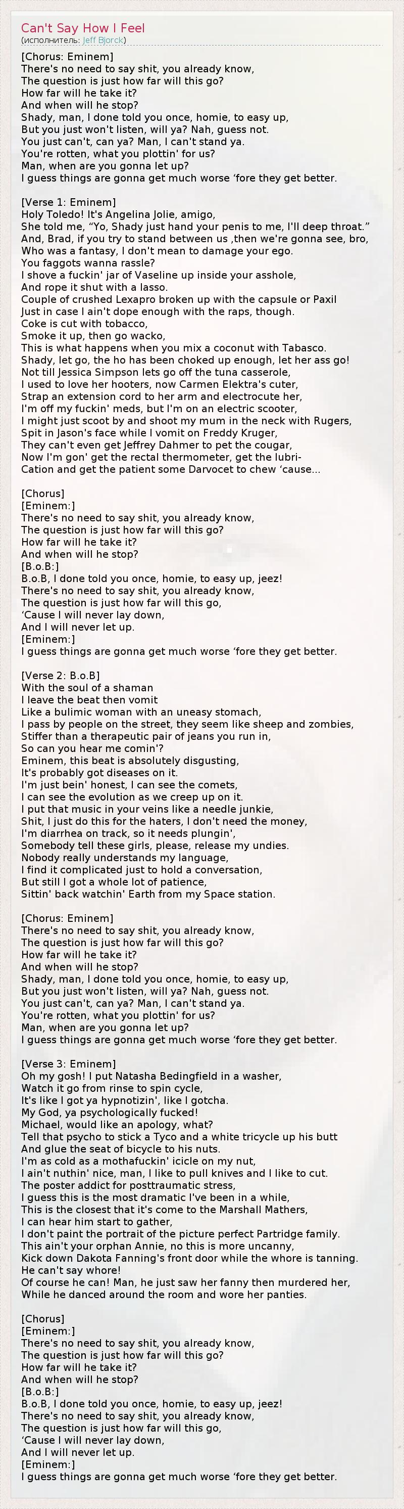 [Припев: Eminem] Ни х**на не надо говорить, вы и так уже знаете, Вопрос лишь в том, насколько далеко это зайдёт? Насколько далеко он зайдёт? И когда он остановится? Шейди, чувак, я уже разок говорил тебе расслабиться, Но ты же не послушаешься, так? Да, думаю, нет. Ты просто не сможешь, так? Чувак, я тебя не выношу. Ты гадок, что ты задумал для нас? Чувак, когда ты уймёшься? Думаю, перед улучшением всё станет гораздо хуже. [Куплет 1: Eminem] Упасть не встать, это же Анджелина Джоли, амиго! Она сказала мне: "Йоу, Шейди, давай сюда свой пенис, у меня глубокая глотка". И, Брэд, если ты попытаешься встать между нами, братан, мы посмотрим, Кто был фантомом. Я не хотел ранить твоего самомнения. Вы, пи**ры, хотите махача? Я засуну полную банку вазелина вам в ж**ы И затяну её лассо. Заглотнул пару толчёных таблеток эсциталопрама вместе с капсулой пароксетина, 1 На всякий случай, а то вдруг от моего рэпа недостаточно плющит. Кокс смешан с табаком, Покурил — и поехал, Вот, что бывает, если смешивать кокос с табаско. Шейди, хватит, ты уже почти задушил шл**у, отпусти её! Нет, пока Джессика Симпсон не прекратит есть запеканку из тунца, Мне раньше нравились её буфера, а сейчас у Кармен Электра лучше, Прикреплю к её руке удлинитель и убью разрядом, Я слез с долбанных лекарств, но сел на электрический скутер, Может, сейчас смоюсь и выстрелю мамке в шею из Ругера, 2 Плюну Джейсону в рожу, пока блюю на Фредди Крюгера, У них даже не получится заставить Джеффри Дамера приручить пуму, 3 Сейчас я пошёл за ректальным термометром, готовьте лубри- Канты и дайте пациенту пожевать попроксифену, потому что... 4 [Припев] [Eminem:] Ни х**на не надо говорить, вы и так уже знаете, Вопрос лишь в том, насколько далеко это зайдёт? Насколько далеко он зайдёт? И когда он остановится? [B.o.B:] Би-оу-Би, чувак, я уже разок говорил тебе расслабиться, блин! Ни х**на не надо говорить, вы и так уже знаете, Вопрос лишь в том, насколько далеко это зайдёт? Потому что я никогда не провалюсь, И никогда не уймусь. [Eminem:] Думаю, перед улучшением всё станет гораздо хуже. [Куплет 2: B.o.B] С духом шамана Я бросаю ритм и рыгаю, Как женщина с булимией и слабым желудком, Я прохожу по улице мимо людей, похожих на овец и зомби, Я жестчё лечебной пары джинсов, в которых ты бегаешь, Услышишь ли ты, как я наступаю? Эминем, бит абсолютно отвратный, Наверное, он ещё и заразный. Я просто честен, я вижу кометы, Я вижу эволюцию, и как мы ползём по ней, Я вгоню эту музыку тебе в вену, как наркоман иглу, Блин, я занимаюсь этим, чтобы посрамить врагов, а не ради денег, У меня диарея на песне, тут нужен вантуз, Кто-нибудь, скажите девчонкам отпустить мои бубенчики. На самом деле, никто не понимает моего языка, Для меня сложно даже поддерживать беседу, Но у меня большой запас терпения, Я сижу и гляжу на Землю со своей орбитальной станции. [Припев: Eminem] Ни х**на не надо говорить, вы и так уже знаете, Вопрос лишь в том, насколько далеко это зайдёт? Насколько далеко он зайдёт? И когда он остановится? Шейди, чувак, я уже разок говорил тебе расслабиться, Но ты же не послушаешься, так? Да, думаю, нет. Ты просто не сможешь, так? Чувак, я тебя не выношу. Ты гадок, что ты задумал для нас? Чувак, когда ты уймёшься? Думаю, перед улучшением всё станет гораздо хуже. [Куплет 3: Eminem] Боже ж мой! Я сунул Наташу Бедингфилд в стиралку, Смотрю, как её полоскало, а потом отжимало, Типа, я загипнотизировал тебя, ты в моей власти, 