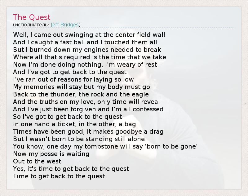 Well, I came out swinging at the center field wall And I caught a fast ball and I touched them all But I burned down my engines needed to break Where all that's required is the time that we take Now I'm done doing nothing, I'm weary of rest And I've got to get back to the quest I've ran out of reasons for laying so low My memories will stay but my body must go Back to the thunder, the rock and the eagle And the truths on my love, only time will reveal And I've just been forgiven and I'm all confessed So I've got to get back to the quest In one hand a ticket, in the other, a bag Times have been good, it makes goodbye a drag But I wasn't born to be standing still alone You know, one day my tombstone will say 'born to be gone' Now my posse is waiting Out to the west Yes, it's time to get back to the quest Time to get back to the quest