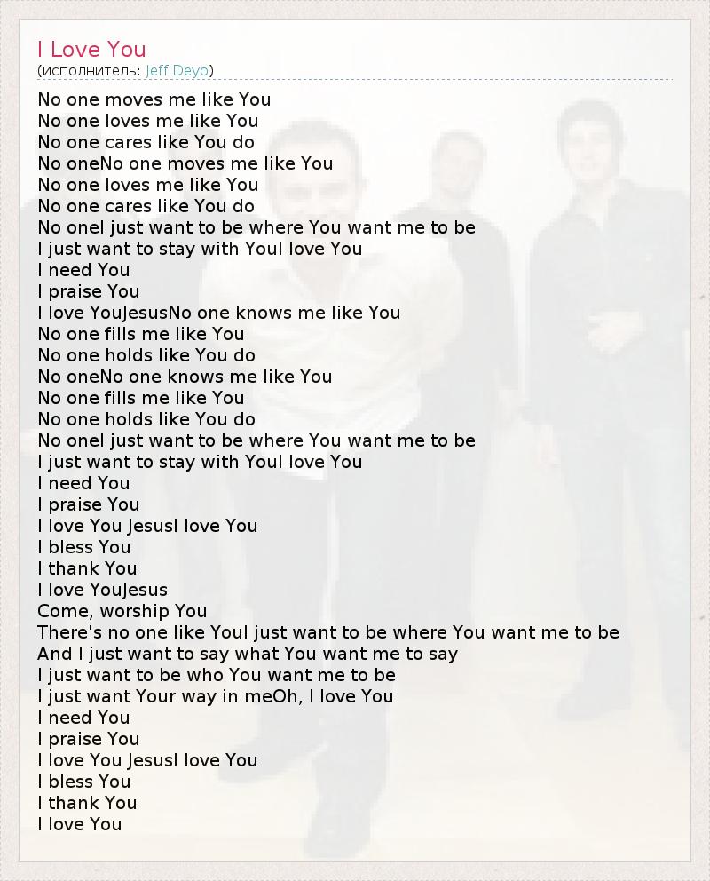 No one moves me like You No one loves me like You No one cares like You do No oneNo one moves me like You No one loves me like You No one cares like You do No oneI just want to be where You want me to be I just want to stay with YouI love You I need You I praise You I love YouJesusNo one knows me like You No one fills me like You No one holds like You do No oneNo one knows me like You No one fills me like You No one holds like You do No oneI just want to be where You want me to be I just want to stay with YouI love You I need You I praise You I love You JesusI love You I bless You I thank You I love YouJesus Come, worship You There's no one like YouI just want to be where You want me to be And I just want to say what You want me to say I just want to be who You want me to be I just want Your way in meOh, I love You I need You I praise You I love You JesusI love You I bless You I thank You I love You