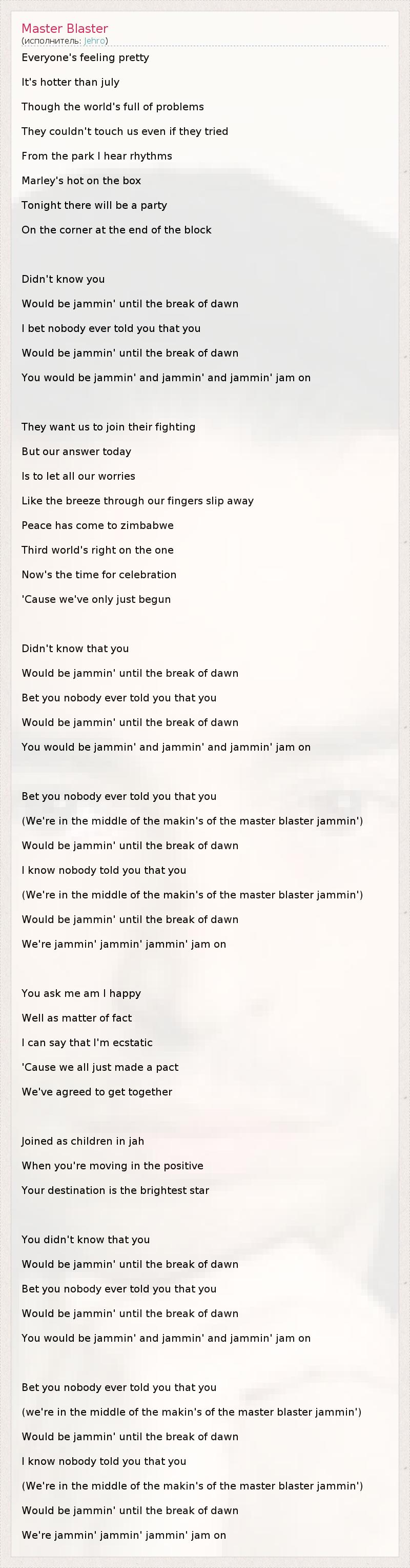 Everyone's feeling pretty It's hotter than july Though the world's full of problems They couldn't touch us even if they tried From the park I hear rhythms Marley's hot on the box Tonight there will be a party On the corner at the end of the block Didn't know you Would be jammin' until the break of dawn I bet nobody ever told you that you Would be jammin' until the break of dawn You would be jammin' and jammin' and jammin' jam on They want us to join their fighting But our answer today Is to let all our worries Like the breeze through our fingers slip away Peace has come to zimbabwe Third world's right on the one Now's the time for celebration 'Cause we've only just begun Didn't know that you Would be jammin' until the break of dawn Bet you nobody ever told you that you Would be jammin' until the break of dawn You would be jammin' and jammin' and jammin' jam on Bet you nobody ever told you that you (We're in the middle of the makin's of the master blaster jammin') Would be jammin' until the break of dawn I know nobody told you that you (We're in the middle of the makin's of the master blaster jammin') Would be jammin' until the break of dawn We're jammin' jammin' jammin' jam on You ask me am I happy Well as matter of fact I can say that I'm ecstatic 'Cause we all just made a pact We've agreed to get together Joined as children in jah When you're moving in the positive Your destination is the brightest star You didn't know that you Would be jammin' until the break of dawn Bet you nobody ever told you that you Would be jammin' until the break of dawn You would be jammin' and jammin' and jammin' jam on Bet you nobody ever told you that you (we're in the middle of the makin's of the master blaster jammin') Would be jammin' until the break of dawn I know nobody told you that you (We're in the middle of the makin's of the master blaster jammin') Would be jammin' until the break of dawn We're jammin' jammin' jammin' jam on