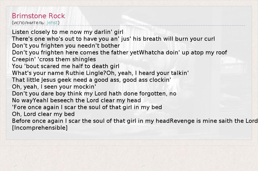 А как ты думаешь, о чем песня "Brimstone Rock" ?