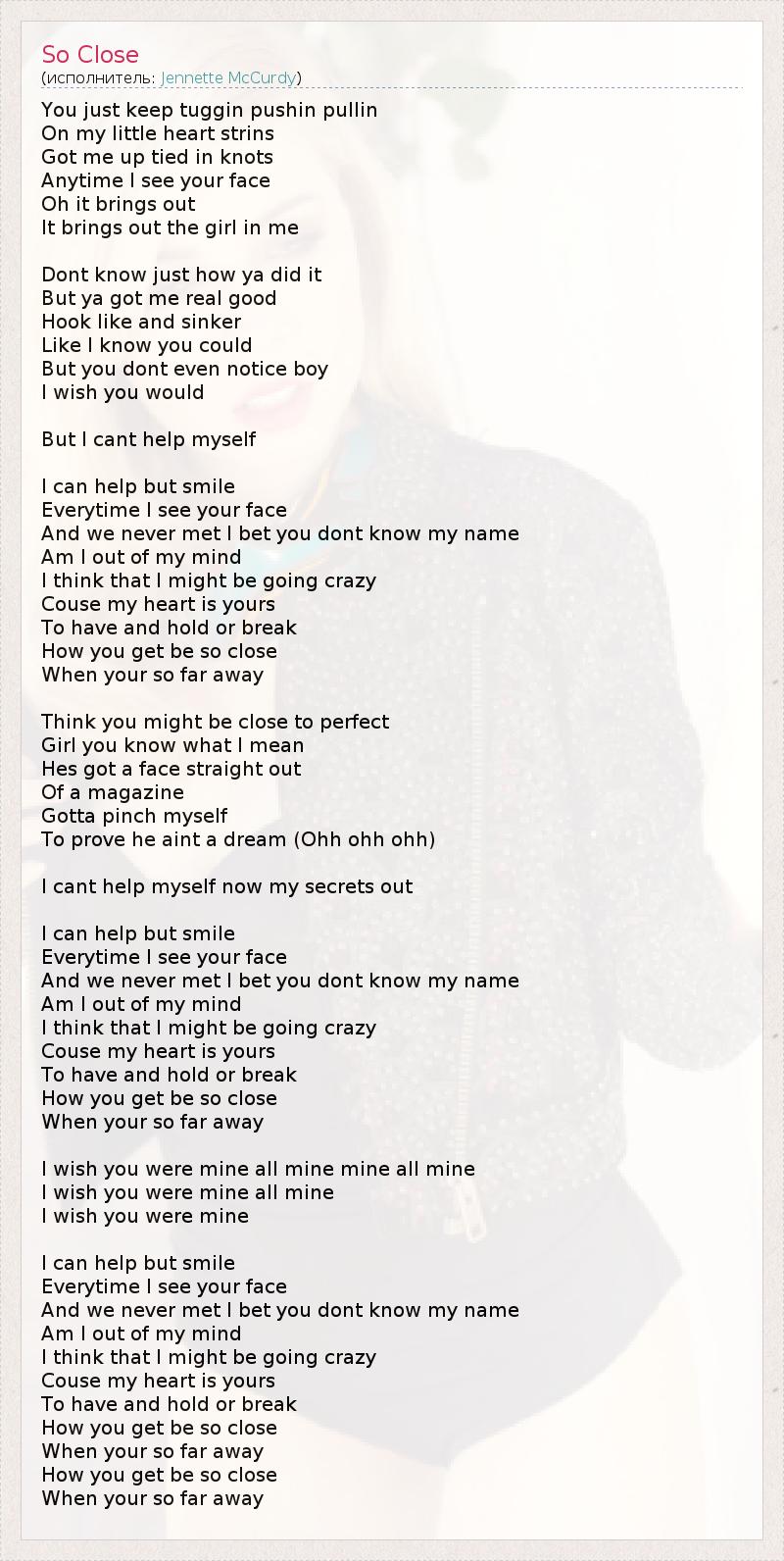 You just keep tuggin pushin pullin On my little heart strins Got me up tied in knots Anytime I see your face Oh it brings out It brings out the girl in me Dont know just how ya did it But ya got me real good Hook like and sinker Like I know you could But you dont even notice boy I wish you would But I cant help myself I can help but smile Everytime I see your face And we never met I bet you dont know my name Am I out of my mind I think that I might be going crazy Couse my heart is yours To have and hold or break How you get be so close When your so far away Think you might be close to perfect Girl you know what I mean Hes got a face straight out Of a magazine Gotta pinch myself To prove he aint a dream (Ohh ohh ohh) I cant help myself now my secrets out I can help but smile Everytime I see your face And we never met I bet you dont know my name Am I out of my mind I think that I might be going crazy Couse my heart is yours To have and hold or break How you get be so close When your so far away I wish you were mine all mine mine all mine I wish you were mine all mine I wish you were mine I can help but smile Everytime I see your face And we never met I bet you dont know my name Am I out of my mind I think that I might be going crazy Couse my heart is yours To have and hold or break How you get be so close When your so far away How you get be so close When your so far away