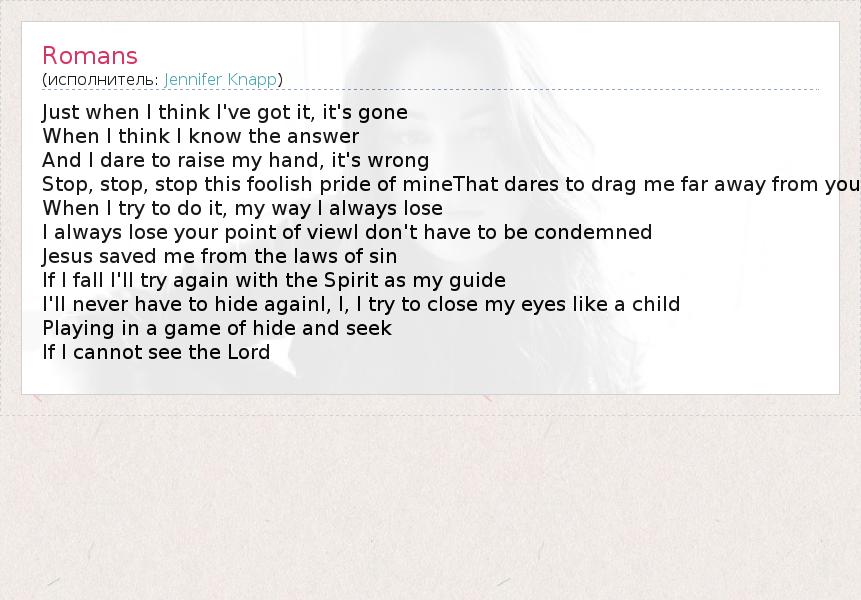 Just when I think I've got it, it's gone When I think I know the answer And I dare to raise my hand, it's wrong Stop, stop, stop this foolish pride of mineThat dares to drag me far away from you When I try to do it, my way I always lose I always lose your point of viewI don't have to be condemned Jesus saved me from the laws of sin If I fall I'll try again with the Spirit as my guide I'll never have to hide againI, I, I try to close my eyes like a child Playing in a game of hide and seek If I cannot see the Lord