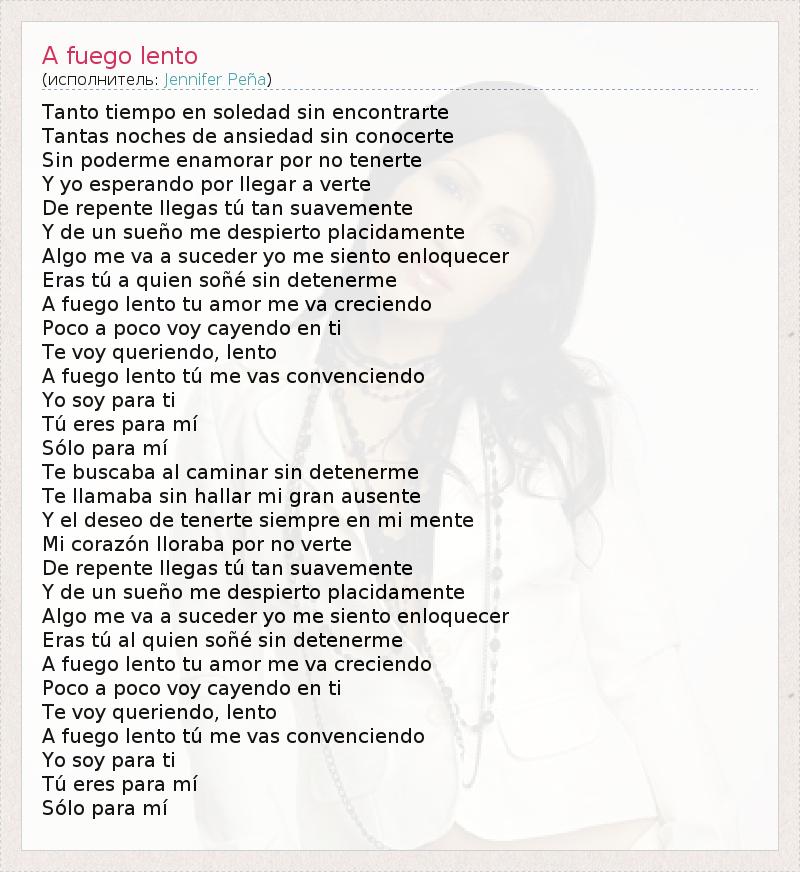 Танто Tiempo ан Соледад грех encontrarte Tantas Noches де Ansiedad грех conocerte Грех poderme enamorar ПОР нет tenerte У йо Esperando POR llegarVerte Де repente llegas tú загар Suavemente У де ООН sueño меня despierto placidamente Algo меня ваsuceder йо ме Siento enloquecer Эры túQuien Соне грех detenerme Fuego Lento ту амор меня ва creciendo ПокоПоко Voy cayendo ан ти Те Voy queriendo , Lento Fuego Lento tú меня VAS convenciendo Йо соевый пункт ти Ту Eres пункт mí Sólo пункт mí Те buscaba др. Caminar грех detenerme Те llamaba грех Hallar миль гран ausente Y -эль Deseo де tenerte Siempre ан миль Mente Ми corazón lloraba ПОР NO Verte Де repente llegas tú загар Suavemente У де ООН sueño меня despierto placidamente Algo меня ваsuceder йо ме Siento enloquecer Эпох Ту аль Quien Соне грех detenerme Fuego Lento ту амор меня ва creciendo ПокоПоко Voy cayendo ан ти Те Voy queriendo , Lento Fuego Lento tú меня VAS convenciendo Йо соевый пункт ти Ту Eres пункт mí Sólo пункт mí