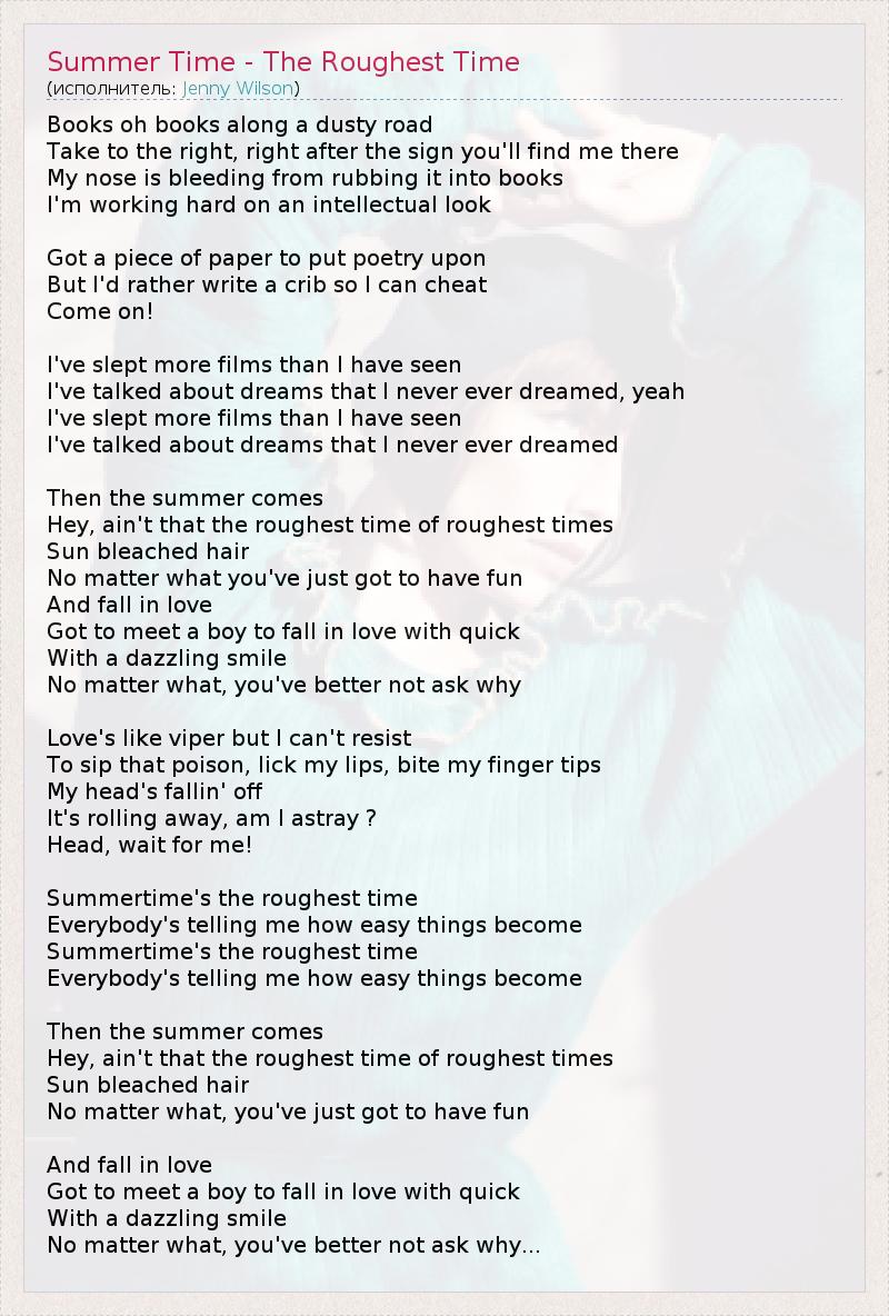 Books oh books along a dusty road Take to the right, right after the sign you'll find me there My nose is bleeding from rubbing it into books I'm working hard on an intellectual look Got a piece of paper to put poetry upon But I'd rather write a crib so I can cheat Come on! I've slept more films than I have seen I've talked about dreams that I never ever dreamed, yeah I've slept more films than I have seen I've talked about dreams that I never ever dreamed Then the summer comes Hey, ain't that the roughest time of roughest times Sun bleached hair No matter what you've just got to have fun And fall in love Got to meet a boy to fall in love with quick With a dazzling smile No matter what, you've better not ask why Love's like viper but I can't resist To sip that poison, lick my lips, bite my finger tips My head's fallin' off It's rolling away, am I astray ? Head, wait for me! Summertime's the roughest time Everybody's telling me how easy things become Summertime's the roughest time Everybody's telling me how easy things become Then the summer comes Hey, ain't that the roughest time of roughest times Sun bleached hair No matter what, you've just got to have fun And fall in love Got to meet a boy to fall in love with quick With a dazzling smile No matter what, you've better not ask why...