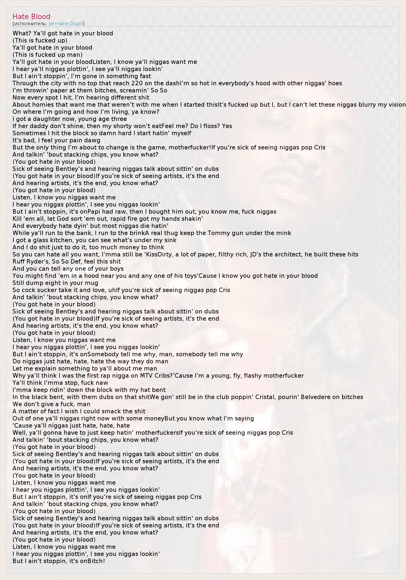 What? Ya'll got hate in your blood (This is fucked up) Ya'll got hate in your blood (This is fucked up man) Ya'll got hate in your bloodListen, I know ya'll niggas want me I hear ya'll niggas plottin', I see ya'll niggas lookin' But I ain't stoppin', I'm gone in something fast Through the city with no top that reach 220 on the dashI'm so hot in everybody's hood with other niggas' hoes I'm throwin' paper at them bitches, screamin' So So Now every spot I hit, I'm hearing different shit About homies that want me that weren't with me when I started thisIt's fucked up but I, but I can't let these niggas blurry my vision On where I'm going and how I'm living, ya know? I got a daughter now, young age three If her daddy don't shine, then my shorty won't eatFeel me? Do I floss? Yes Sometimes I hit the block so damn hard I start hatin' myself It's bad, I feel your pain dawg But the only thing I'm about to change is the game, motherfucker!If you're sick of seeing niggas pop Cris And talkin' 'bout stacking chips, you know what? (You got hate in your blood) Sick of seeing Bentley's and hearing niggas talk about sittin' on dubs (You got hate in your blood)If you're sick of seeing artists, it's the end And hearing artists, it's the end, you know what? (You got hate in your blood) Listen, I know you niggas want me I hear you niggas plottin', I see you niggas lookin' But I ain't stoppin, it's onPapi had raw, then I bought him out, you know me, fuck niggas Kill 'em all, let God sort 'em out, rapid fire got my hands shakin' And everybody hate dyin' but most niggas die hatin' While ya'll run to the bank, I run to the brinkA real thug keep the Tommy gun under the mink I got a glass kitchen, you can see what's under my sink And I do shit just to do it, too much money to think So you can hate all you want, I'mma still be 'KissDirty, a lot of paper, filthy rich, JD's the architect, he built these hits Ruff Ryder's, So So Def, feel this shit And you can tell any one of your boys You might find 'em in a hood near you and any one of his toys'Cause I know you got hate in your blood Still dump eight in your mug So cock sucker take it and love, uhIf you're sick of seeing niggas pop Cris And talkin' 'bout stacking chips, you know what? (You got hate in your blood) Sick of seeing Bentley's and hearing niggas talk about sittin' on dubs (You got hate in your blood)If you're sick of seeing artists, it's the end And hearing artists, it's the end, you know what? (You got hate in your blood) Listen, I know you niggas want me I hear you niggas plottin', I see you niggas lookin' But I ain't stoppin, it's onSomebody tell me why, man, somebody tell me why Do niggas just hate, hate, hate the way they do man Let me explain something to ya'll about me man Why ya'll think I was the first rap nigga on MTV Cribs?'Cause I'm a young, fly, flashy motherfucker Ya'll think I'mma stop, fuck naw I'mma keep ridin' down the block with my hat bent In the black bent, with them dubs on that shitWe gon' still be in the club poppin' Cristal, pourin' Belvedere on bitches We don't give a fuck, man A matter of fact I wish I could smack the shit Out of one ya'll niggas right now with some moneyBut you know what I'm saying 'Cause ya'll niggas just hate, hate, hate Well, ya'll gonna have to just keep hatin' motherfuckersIf you're sick of seeing niggas pop Cris And talkin' 'bout stacking chips, you know what? (You got hate in your blood) Sick of seeing Bentley's and hearing niggas talk about sittin' on dubs (You got hate in your blood)If you're sick of seeing artists, it's the end And hearing artists, it's the end, you know what? (You got hate in your blood) Listen, I know you niggas want me I hear you niggas plottin', I see you niggas lookin' But I ain't stoppin, it's onIf you're sick of seeing niggas pop Cris And talkin' 'bout stacking chips, you know what? (You got hate in your blood) Sick of seeing Bentley's and hearing niggas talk about sittin' on dubs (You got hate in your blood)If you're sick of seeing artists, it's the end And hearing artists, it's the end, you know what? (You got hate in your blood) Listen, I know you niggas want me I hear you niggas plottin', I see you niggas lookin' But I ain't stoppin, it's onBitch!