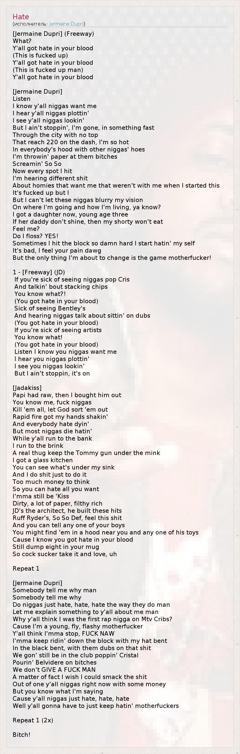 [Jermaine Dupri] (Freeway) What? Y'all got hate in your blood (This is fucked up) Y'all got hate in your blood (This is fucked up man) Y'all got hate in your blood [Jermaine Dupri] Listen I know y'all niggas want me I hear y'all niggas plottin' I see y'all niggas lookin' But I ain't stoppin', I'm gone, in something fast Through the city with no top That reach 220 on the dash, I'm so hot In everybody's hood with other niggas' hoes I'm throwin' paper at them bitches Screamin' So So Now every spot I hit I'm hearing different shit About homies that want me that weren't with me when I started this It's fucked up but I But I can't let these niggas blurry my vision On where I'm going and how I'm living, ya know? I got a daughter now, young age three If her daddy don't shine, then my shorty won't eat Feel me? Do I floss? YES! Sometimes I hit the block so damn hard I start hatin' my self It's bad, I feel your pain dawg But the only thing I'm about to change is the game motherfucker! 1 - [Freeway] (JD) If you're sick of seeing niggas pop Cris And talkin' bout stacking chips You know what?! (You got hate in your blood) Sick of seeing Bentley's And hearing niggas talk about sittin' on dubs (You got hate in your blood) If you're sick of seeing artists You know what! (You got hate in your blood) Listen I know you niggas want me I hear you niggas plottin' I see you niggas lookin' But I ain't stoppin, it's on [Jadakiss] Papi had raw, then I bought him out You know me, fuck niggas Kill 'em all, let God sort 'em out Rapid fire got my hands shakin' And everybody hate dyin' But most niggas die hatin' While y'all run to the bank I run to the brink A real thug keep the Tommy gun under the mink I got a glass kitchen You can see what's under my sink And I do shit just to do it Too much money to think So you can hate all you want I'mma still be 'Kiss Dirty, a lot of paper, filthy rich JD's the architect, he built these hits Ruff Ryder's, So So Def, feel this shit And you can tell any one of your boys You might find 'em in a hood near you and any one of his toys Cause I know you got hate in your blood Still dump eight in your mug So cock sucker take it and love, uh Repeat 1 [Jermaine Dupri] Somebody tell me why man Somebody tell me why Do niggas just hate, hate, hate the way they do man Let me explain something to y'all about me man Why y'all think I was the first rap nigga on Mtv Cribs? Cause I'm a young, fly, flashy motherfucker Y'all think I'mma stop, FUCK NAW I'mma keep ridin' down the block with my hat bent In the black bent, with them dubs on that shit We gon' still be in the club poppin' Cristal Pourin' Belvidere on bitches We don't GIVE A FUCK MAN A matter of fact I wish I could smack the shit Out of one y'all niggas right now with some money But you know what I'm saying Cause y'all niggas just hate, hate, hate Well y'all gonna have to just keep hatin' motherfuckers Repeat 1 (2x) Bitch!