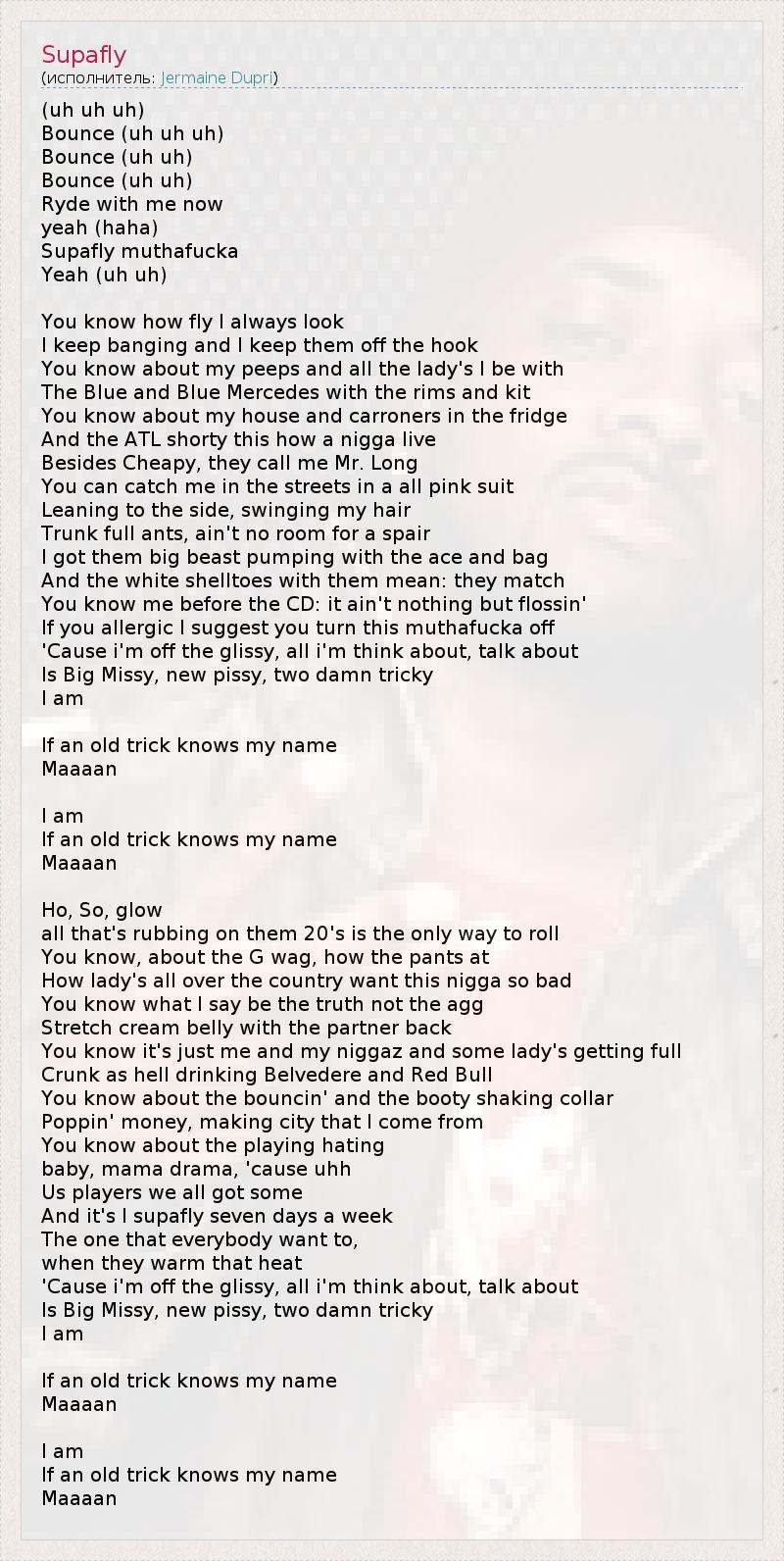 (uh uh uh) Bounce (uh uh uh) Bounce (uh uh) Bounce (uh uh) Ryde with me now yeah (haha) Supafly muthafucka Yeah (uh uh) You know how fly I always look I keep banging and I keep them off the hook You know about my peeps and all the lady's I be with The Blue and Blue Mercedes with the rims and kit You know about my house and carroners in the fridge And the ATL shorty this how a nigga live Besides Cheapy, they call me Mr. Long You can catch me in the streets in a all pink suit Leaning to the side, swinging my hair Trunk full ants, ain't no room for a spair I got them big beast pumping with the ace and bag And the white shelltoes with them mean: they match You know me before the CD: it ain't nothing but flossin' If you allergic I suggest you turn this muthafucka off 'Cause i'm off the glissy, all i'm think about, talk about Is Big Missy, new pissy, two damn tricky I am If an old trick knows my name Maaaan I am If an old trick knows my name Maaaan Ho, So, glow all that's rubbing on them 20's is the only way to roll You know, about the G wag, how the pants at How lady's all over the country want this nigga so bad You know what I say be the truth not the agg Stretch cream belly with the partner back You know it's just me and my niggaz and some lady's getting full Crunk as hell drinking Belvedere and Red Bull You know about the bouncin' and the booty shaking collar Poppin' money, making city that I come from You know about the playing hating baby, mama drama, 'cause uhh Us players we all got some And it's I supafly seven days a week The one that everybody want to, when they warm that heat 'Cause i'm off the glissy, all i'm think about, talk about Is Big Missy, new pissy, two damn tricky I am If an old trick knows my name Maaaan I am If an old trick knows my name Maaaan