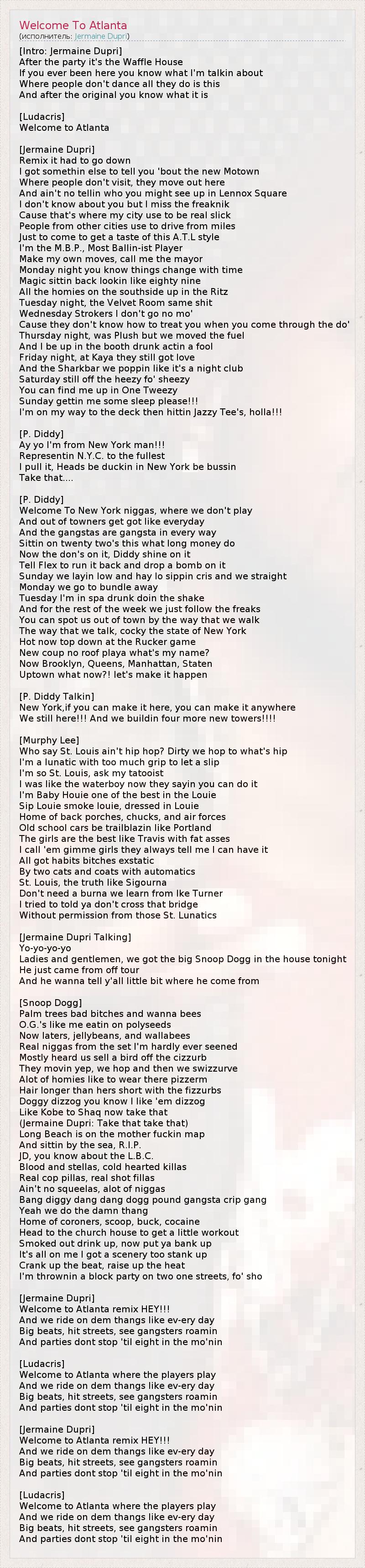 [Intro: Jermaine Dupri] After the party it's the Waffle House If you ever been here you know what I'm talkin about Where people don't dance all they do is this And after the original you know what it is [Ludacris] Welcome to Atlanta [Jermaine Dupri] Remix it had to go down I got somethin else to tell you 'bout the new Motown Where people don't visit, they move out here And ain't no tellin who you might see up in Lennox Square I don't know about you but I miss the freaknik Cause that's where my city use to be real slick People from other cities use to drive from miles Just to come to get a taste of this A.T.L style I'm the M.B.P., Most Ballin-ist Player Make my own moves, call me the mayor Monday night you know things change with time Magic sittin back lookin like eighty nine All the homies on the southside up in the Ritz Tuesday night, the Velvet Room same shit Wednesday Strokers I don't go no mo' Cause they don't know how to treat you when you come through the do' Thursday night, was Plush but we moved the fuel And I be up in the booth drunk actin a fool Friday night, at Kaya they still got love And the Sharkbar we poppin like it's a night club Saturday still off the heezy fo' sheezy You can find me up in One Tweezy Sunday gettin me some sleep please!!! I'm on my way to the deck then hittin Jazzy Tee's, holla!!! [P. Diddy] Ay yo I'm from New York man!!! Representin N.Y.C. to the fullest I pull it, Heads be duckin in New York be bussin Take that.... [P. Diddy] Welcome To New York niggas, where we don't play And out of towners get got like everyday And the gangstas are gangsta in every way Sittin on twenty two's this what long money do Now the don's on it, Diddy shine on it Tell Flex to run it back and drop a bomb on it Sunday we layin low and hay lo sippin cris and we straight Monday we go to bundle away Tuesday I'm in spa drunk doin the shake And for the rest of the week we just follow the freaks You can spot us out of town by the way that we walk The way that we talk, cocky the state of New York Hot now top down at the Rucker game New coup no roof playa what's my name? Now Brooklyn, Queens, Manhattan, Staten Uptown what now?! let's make it happen [P. Diddy Talkin] New York,if you can make it here, you can make it anywhere We still here!!! And we buildin four more new towers!!!! [Murphy Lee] Who say St. Louis ain't hip hop? Dirty we hop to what's hip I'm a lunatic with too much grip to let a slip I'm so St. Louis, ask my tatooist I was like the waterboy now they sayin you can do it I'm Baby Houie one of the best in the Louie Sip Louie smoke louie, dressed in Louie Home of back porches, chucks, and air forces Old school cars be trailblazin like Portland The girls are the best like Travis with fat asses I call 'em gimme girls they always tell me I can have it All got habits bitches exstatic By two cats and coats with automatics St. Louis, the truth like Sigourna Don't need a burna we learn from Ike Turner I tried to told ya don't cross that bridge Without permission from those St. Lunatics [Jermaine Dupri Talking] Yo-yo-yo-yo Ladies and gentlemen, we got the big Snoop Dogg in the house tonight He just came from off tour And he wanna tell y'all little bit where he come from [Snoop Dogg] Palm trees bad bitches and wanna bees O.G.'s like me eatin on polyseeds Now laters, jellybeans, and wallabees Real niggas from the set I'm hardly ever seened Mostly heard us sell a bird off the cizzurb They movin yep, we hop and then we swizzurve Alot of homies like to wear there pizzerm Hair longer than hers short with the fizzurbs Doggy dizzog you know I like 'em dizzog Like Kobe to Shaq now take that (Jermaine Dupri: Take that take that) Long Beach is on the mother fuckin map And sittin by the sea, R.I.P. JD, you know about the L.B.C. Blood and stellas, cold hearted killas Real cop pillas, real shot fillas Ain't no squeelas, alot of niggas Bang diggy dang dang dogg pound gangsta crip gang Yeah we do the damn thang Home of coroners, scoop, buck, cocaine Head to the church house to get a little workout Smoked out drink up, now put ya bank up It's all on me I got a scenery too stank up Crank up the beat, raise up the heat I'm thrownin a block party on two one streets, fo' sho [Jermaine Dupri] Welcome to Atlanta remix HEY!!! And we ride on dem thangs like ev-ery day Big beats, hit streets, see gangsters roamin And parties dont stop 'til eight in the mo'nin [Ludacris] Welcome to Atlanta where the players play And we ride on dem thangs like ev-ery day Big beats, hit streets, see gangsters roamin And parties dont stop 'til eight in the mo'nin [Jermaine Dupri] Welcome to Atlanta remix HEY!!! And we ride on dem thangs like ev-ery day Big beats, hit streets, see gangsters roamin And parties dont stop 'til eight in the mo'nin [Ludacris] Welcome to Atlanta where the players play And we ride on dem thangs like ev-ery day Big beats, hit streets, see gangsters roamin And parties dont stop 'til eight in the mo'nin