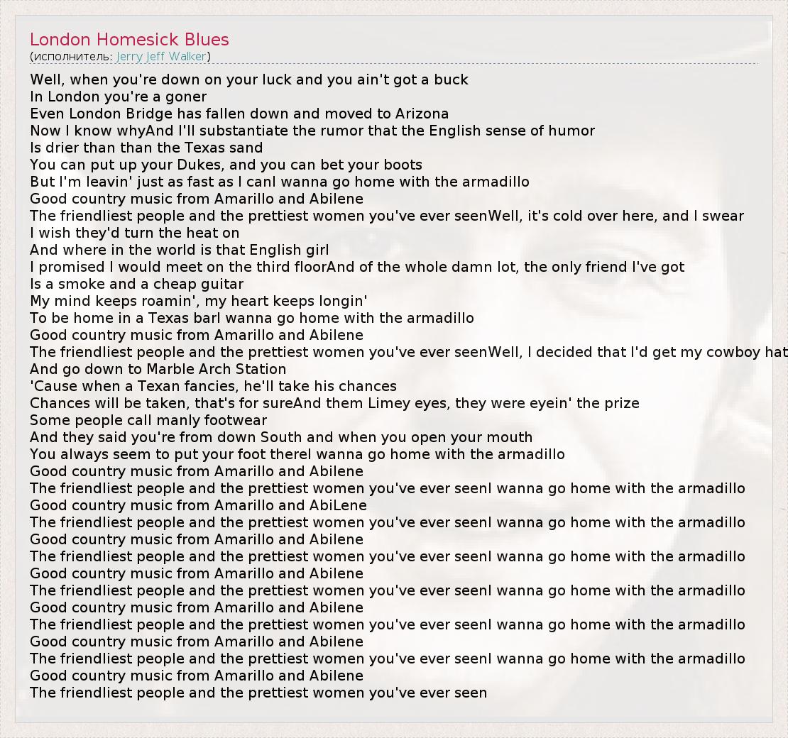 Well, when you're down on your luck and you ain't got a buck In London you're a goner Even London Bridge has fallen down and moved to Arizona Now I know whyAnd I'll substantiate the rumor that the English sense of humor Is drier than than the Texas sand You can put up your Dukes, and you can bet your boots But I'm leavin' just as fast as I canI wanna go home with the armadillo Good country music from Amarillo and Abilene The friendliest people and the prettiest women you've ever seenWell, it's cold over here, and I swear I wish they'd turn the heat on And where in the world is that English girl I promised I would meet on the third floorAnd of the whole damn lot, the only friend I've got Is a smoke and a cheap guitar My mind keeps roamin', my heart keeps longin' To be home in a Texas barI wanna go home with the armadillo Good country music from Amarillo and Abilene The friendliest people and the prettiest women you've ever seenWell, I decided that I'd get my cowboy hat And go down to Marble Arch Station 'Cause when a Texan fancies, he'll take his chances Chances will be taken, that's for sureAnd them Limey eyes, they were eyein' the prize Some people call manly footwear And they said you're from down South and when you open your mouth You always seem to put your foot thereI wanna go home with the armadillo Good country music from Amarillo and Abilene The friendliest people and the prettiest women you've ever seenI wanna go home with the armadillo Good country music from Amarillo and AbiLene The friendliest people and the prettiest women you've ever seenI wanna go home with the armadillo Good country music from Amarillo and Abilene The friendliest people and the prettiest women you've ever seenI wanna go home with the armadillo Good country music from Amarillo and Abilene The friendliest people and the prettiest women you've ever seenI wanna go home with the armadillo Good country music from Amarillo and Abilene The friendliest people and the prettiest women you've ever seenI wanna go home with the armadillo Good country music from Amarillo and Abilene The friendliest people and the prettiest women you've ever seenI wanna go home with the armadillo Good country music from Amarillo and Abilene The friendliest people and the prettiest women you've ever seen